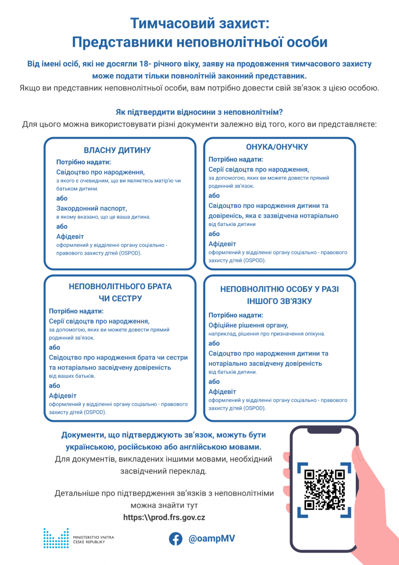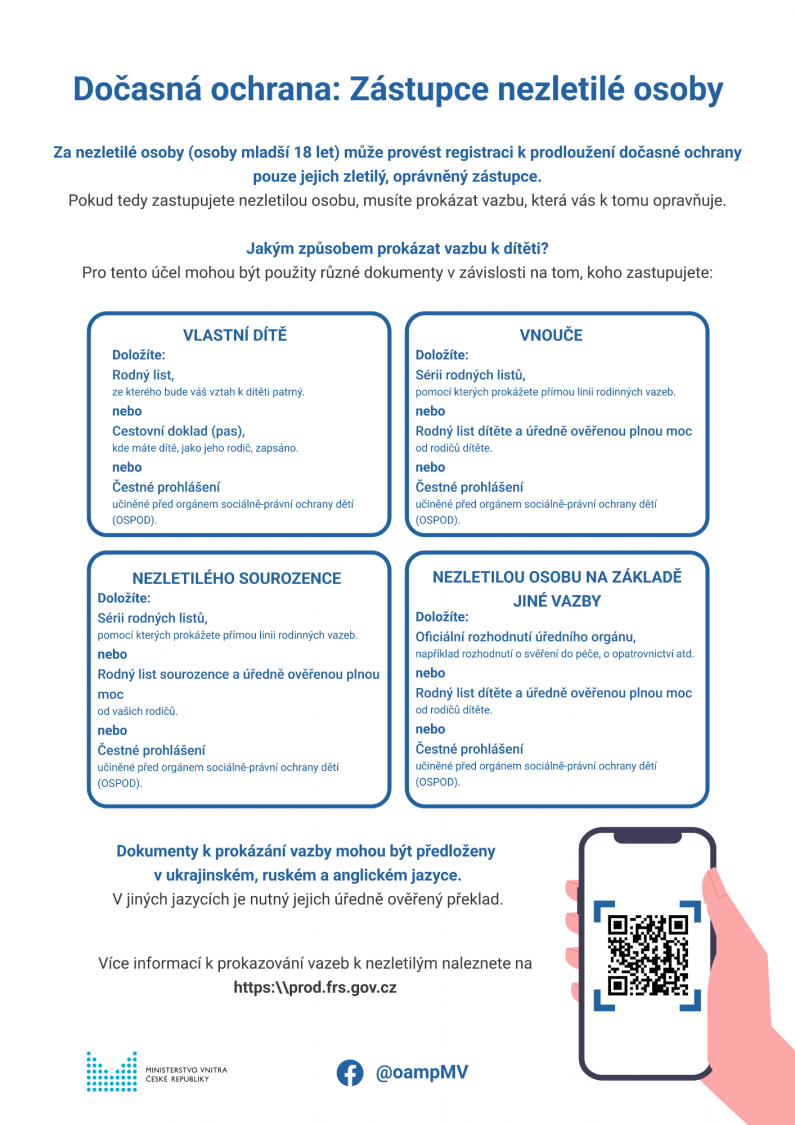Zástupce nezletilé osoby (osoby mladší 18 let) může provést registraci k prodloužení dočasné ochrany pouze jejich zletilý, oprávněný zástupce. Pokud tedy zastupujete nezletilou osobu, musíte prokázat vazbu, která vás k tomu opravňuje. Pro tento účel mohou být použity různé dokumenty v závislosti na tom, koho zastupujete.