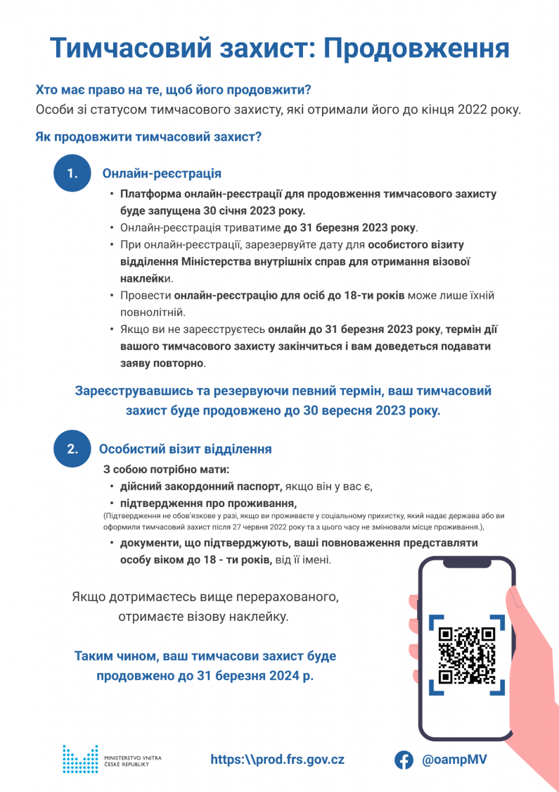 Online registrace k prodlužování dočasné ochrany je fuknčí od 30. 1. 2023 do 31. 3. 2023. Registrovat se na prodloužení dočasné ochrany můžete pouze online.