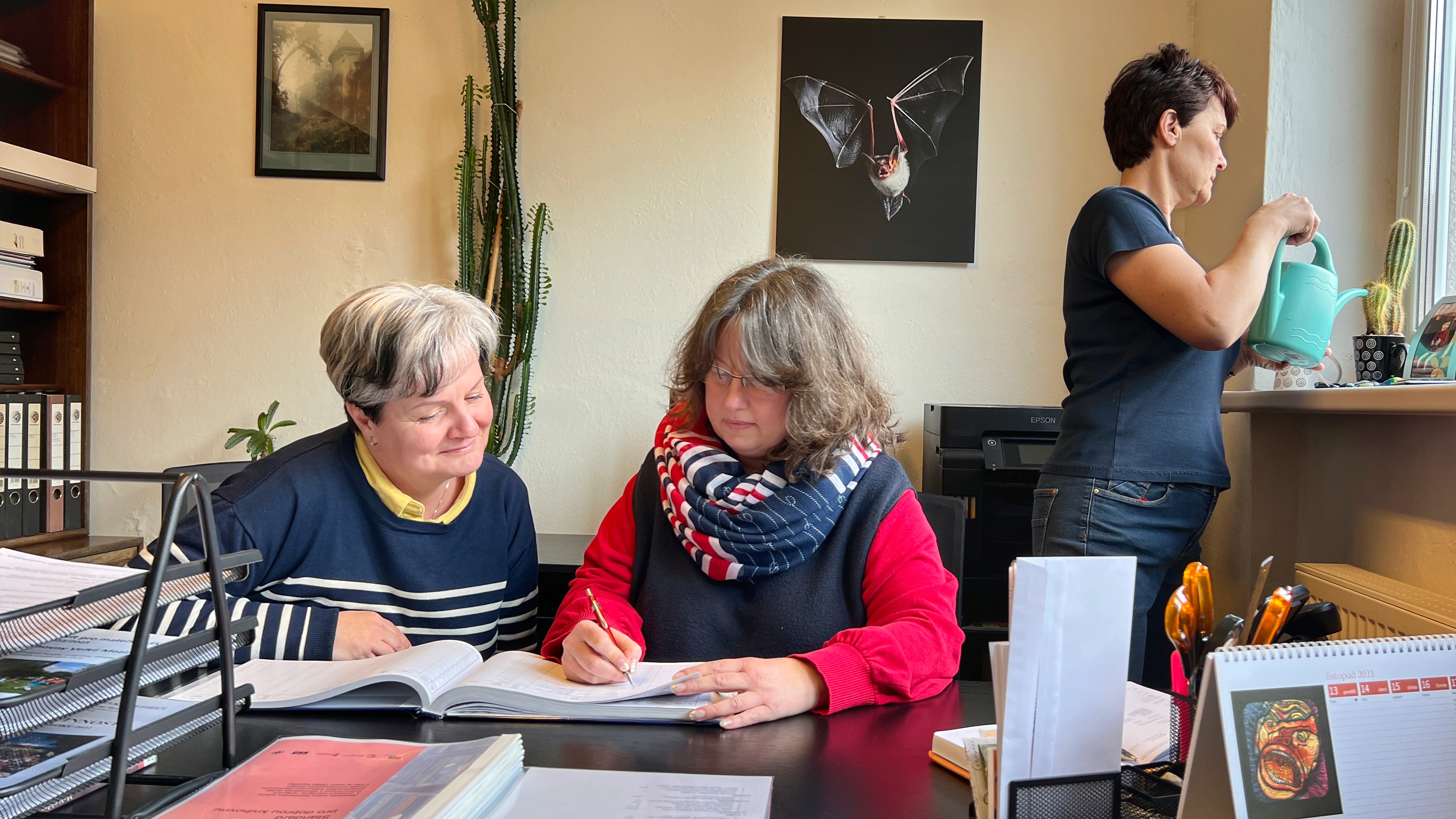 Tenhle trojlístek? Opět zleva. Zuzka vládne sekretariátu a zvládne kde co. Nejraději se pohybuje ve světě čísel, ale umí se ponořit i do oblíbených románů. U Ivany v ředitelně je často dost rušno, protože její vášní je řešit souběžně celou řadu věcí. Oblíbila si současné české autory. Do třetice Zdenka, která se tu stará o pořádek a nejvíce si užívá péči o rostliny.