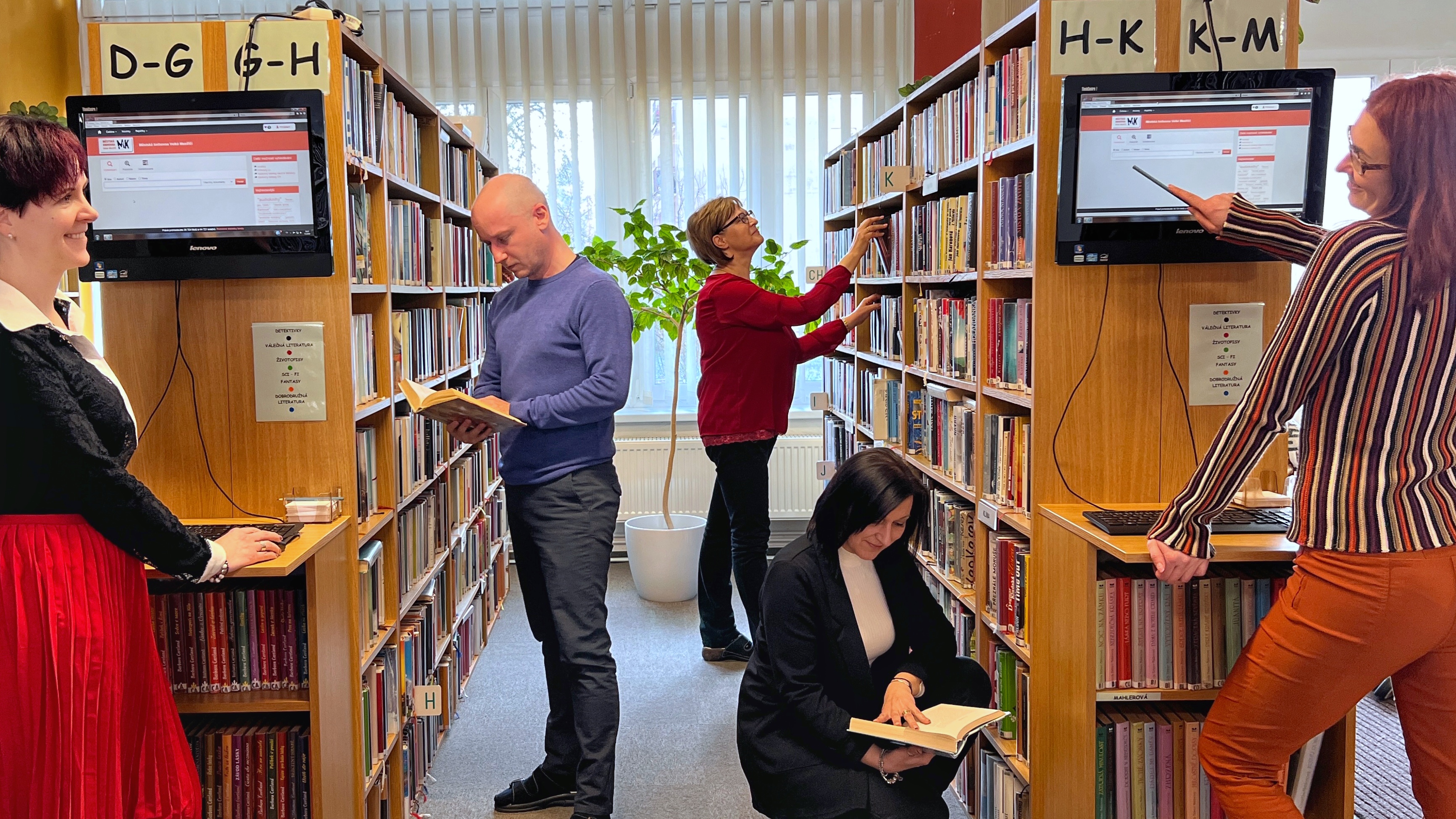 Tak koho to tu máme? Tuhle pětici určitě znáte. Zcela vlevo stojí Jitka, obvykle se vyskytuje v půjčovně pro dospělé, ráda čte thrillery a oblíbenou pracovní činností je katalogizace. Josef, služebně nejmladší knihovník ze stejného oddělení, listuje v nějaké sci‑fi, protože to mu sedí. A co rád dělá? Právě proto, že je nováčkem, tak prý zatím úplně všechno. Do knížky nahlíží také Katka z půjčovny pro děti. Začetla se do románu o druhé světové válce, tohle téma ji totiž baví. Těšívá se na naše programy v terénu. V pozadí u regálu Jitka, knihovnice internetové studovny. Prý není nic, co by ji v práci nebavilo. Naopak si užívá její pestrost, zrovna jako ráda čte od každého žánru trochu. Z druhé strany postává Lucka. Častý výskyt: dětské oddělení, vyhledávaná četba: naprosto jakákoliv, oblíbená práce: pod tlakem hromady děcek, které současně půjčují, vracejí, soutěží, klábosí a chaosí.
