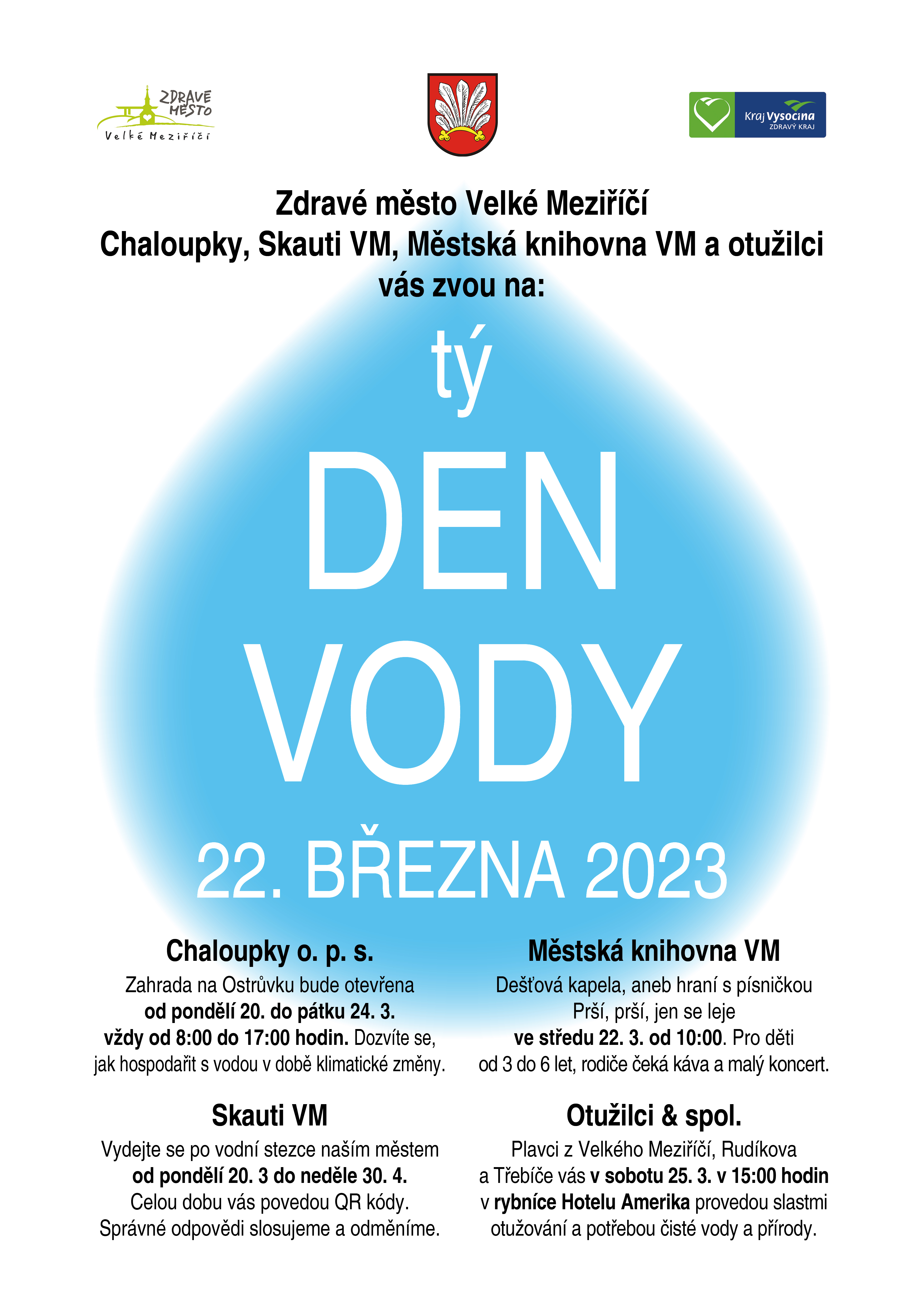 Ve Velkém Meziříčí letošní Den vody připomenou čtyři subjekty: Skaut Velké Meziříčí, Chaloupky, o. p. s., a lesní mateřská škola, otužilci a Městská knihovna Velké Meziříčí. Čistota vod se týká všech naprosto bezprostředně. Skauti a ekocentrum Chaloupky o ochraně životního prostředí učí a k odpovědnému chování vedou děti, otužilci se celoročně noří do nejrůznějších rybníků, řek a tůní, a jejich čistotu tak mají z první ruky.