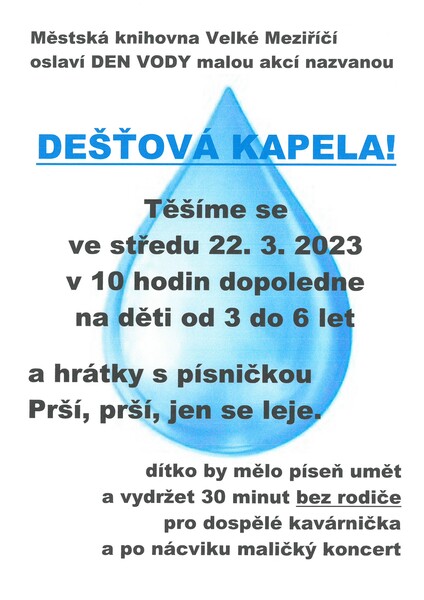 Na středu 22. března od 10 hodin připravila pro děti od tří do šesti let hraní s písničkou Prší, prší, jen se leje nazvané Dešťová kapela. Rodiče čeká nejprve káva a potom malý koncert.