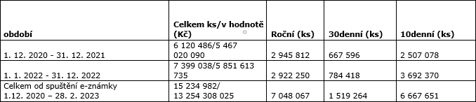 Elektronické dálniční známky se prodávají více než před rokem. Od počátku prosince 2022 do konce února 2023, tedy v období tradiční prodejní špičky, si jich lidé koupili celkem 2,22 milionu, oproti loňským 2,16 milionu e-známek. V době nejvyšších prodejů využívá státní e-shop edalnice.cz ke koupi známky až 98 procent řidičů.