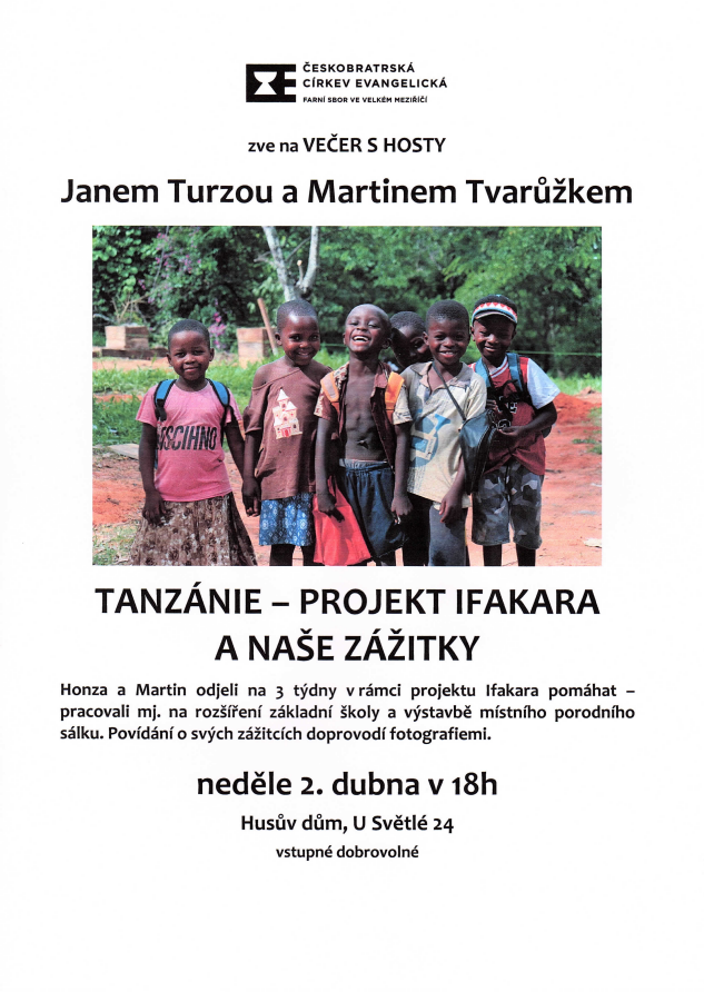 V neděli 2. dubna od 18:00 hodin se v Husově domě budou moci zájemci setkat s Janem Turzou a Martinem Tvarůžkem, kteří na 3 týdny, v rámci projektu Ifakara, vyrazili pomáhat do Tanzánie.