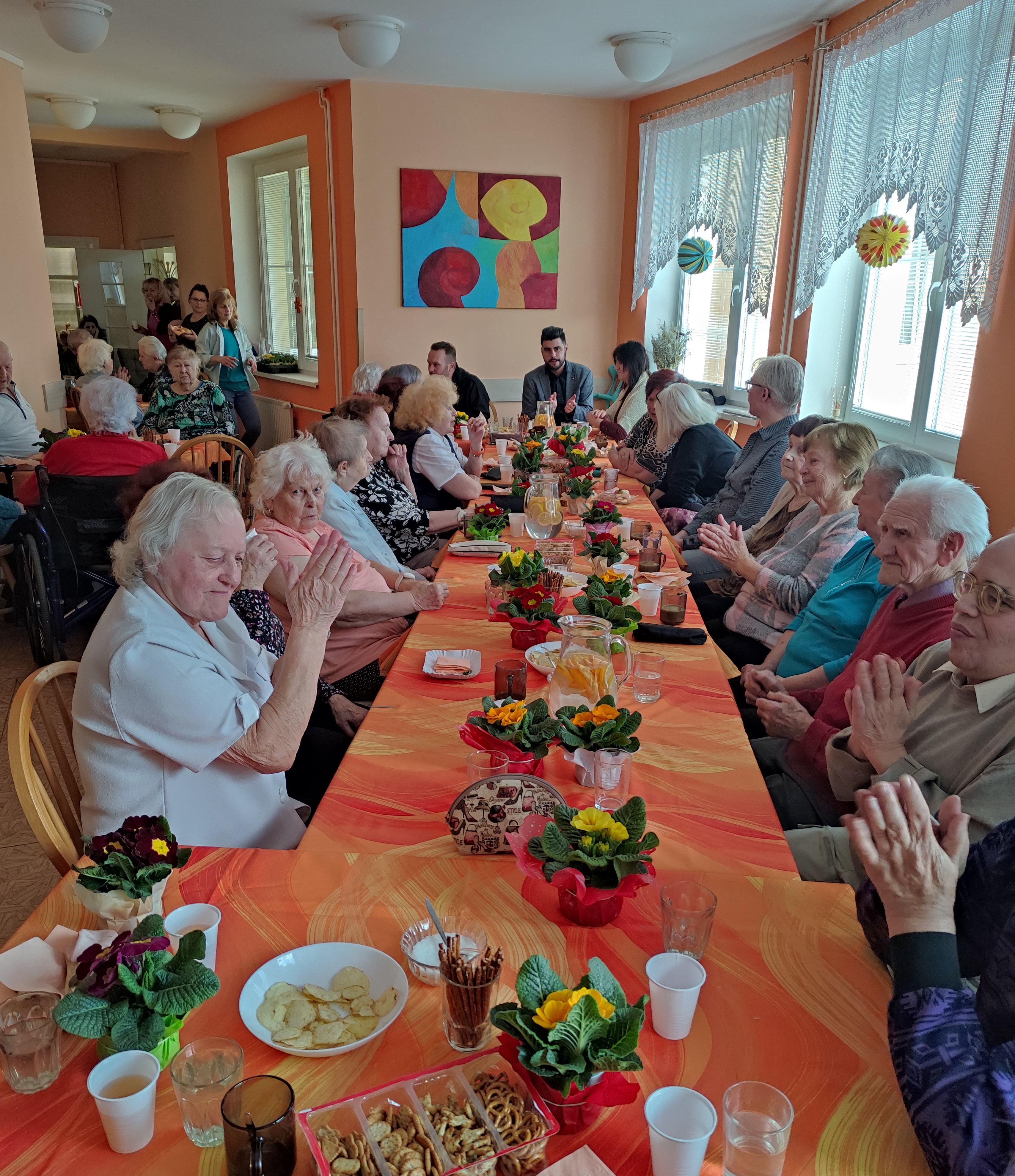 Odpoledne 7. března se tak u nás opravdu vydařilo. Přišli všichni, kdo mohli, a to nejen klienti, ale i většina zaměstnanců. A nebylo rozdílu mezi těmito dvěma skupinami. Patřili jsme prostě k sobě, bylo nám spolu dobře. Pozvání k nám přijal i pan starosta. Paní ředitelka uložila zaměstnancům připravit malé pohoštění, byl pozván oblíbený harmonikář s bubeníkem a zpívalo se. I když nám hlasy už neslouží tak jak dřív, lidových písní, které nás naučily naše maminky, zazněla spousta. V závěru odpoledne ti nejodvážnější i tancovali. Rozcházeli jsme se s hezkým pocitem, že v našem životě nejsou jen starosti, ale občas i radost. Proto všem, kdo se zasloužili o toto pěkné odpoledne, děkujeme. Velké díky patří zahradnictví Flouma za krásné jarní petrklíče. Přejeme hezké a klidné jaro nejen sobě, ale i celé naší malé, krásné zemi.