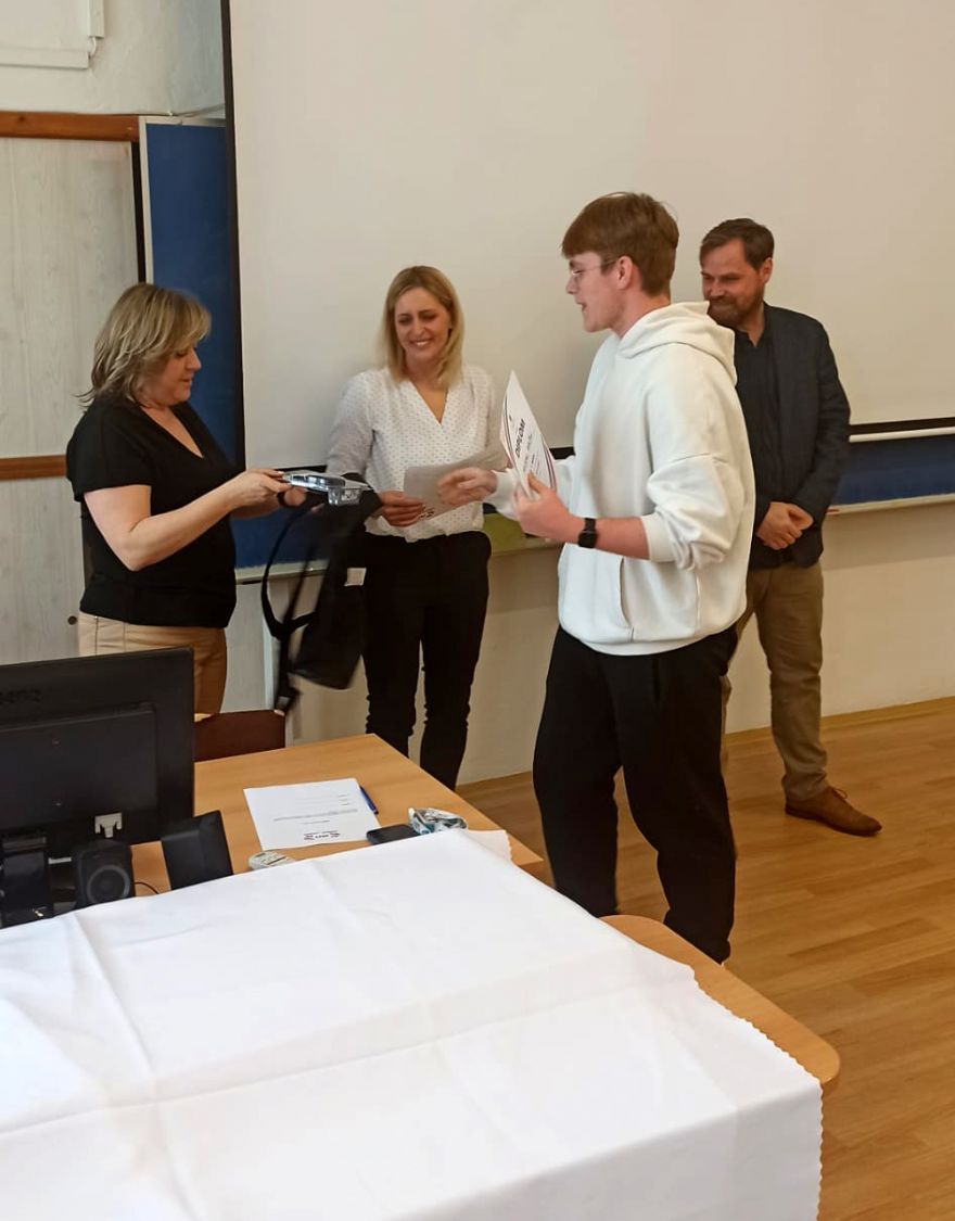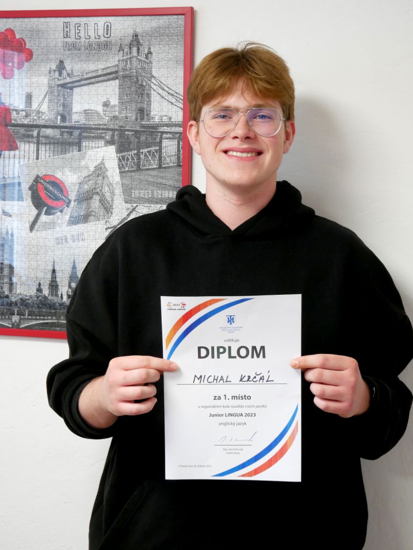 Soutěž probíhá ve čtení a porozumění textu, gramatickém testu, poslechu a ústní komunikaci. Vše v úrovní B2, což znamená vyšší úroveň než při maturitní zkoušce. Stejně jako vloni získal zlatou medaili Michal, Jakub obsadil místo sedmé. Jak nám prozradila učitelka angličtiny Gabriela Kratochvílová, oběma žákům byla za skvělou reprezentaci školy udělena pochvala.