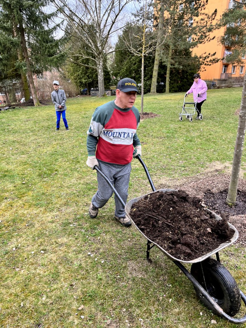 Ačkoliv je stacionář nedaleko centra Velkého Meziříčí, kolem budovy je zahrada, o kterou pečují i samotní uživatelé a do jarních prací se pustili, jak to jenom počasí dovolilo. Cílem pobytu na zahradě není jenom práce, ale i možnost vnímat probouzející se jarní přírodu. Letošním bonusem při pobytu na zahradě bylo objevení prvních pupenů a lístků vloni vysazených stromů a trvalek, stejně tak i prvních květů narcisek a tulipánů.