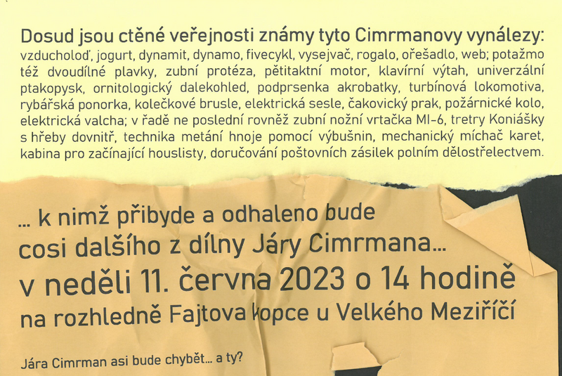 Odhalení díla Járy Cimrmana pod rozhlednou na Fajtově kopci proběhne v neděli 11. června ve 14 hodin. Obdivovatelé tvorby snad nejslavnějšího vynálezce by si akci rozhodně neměli nechat ujít.