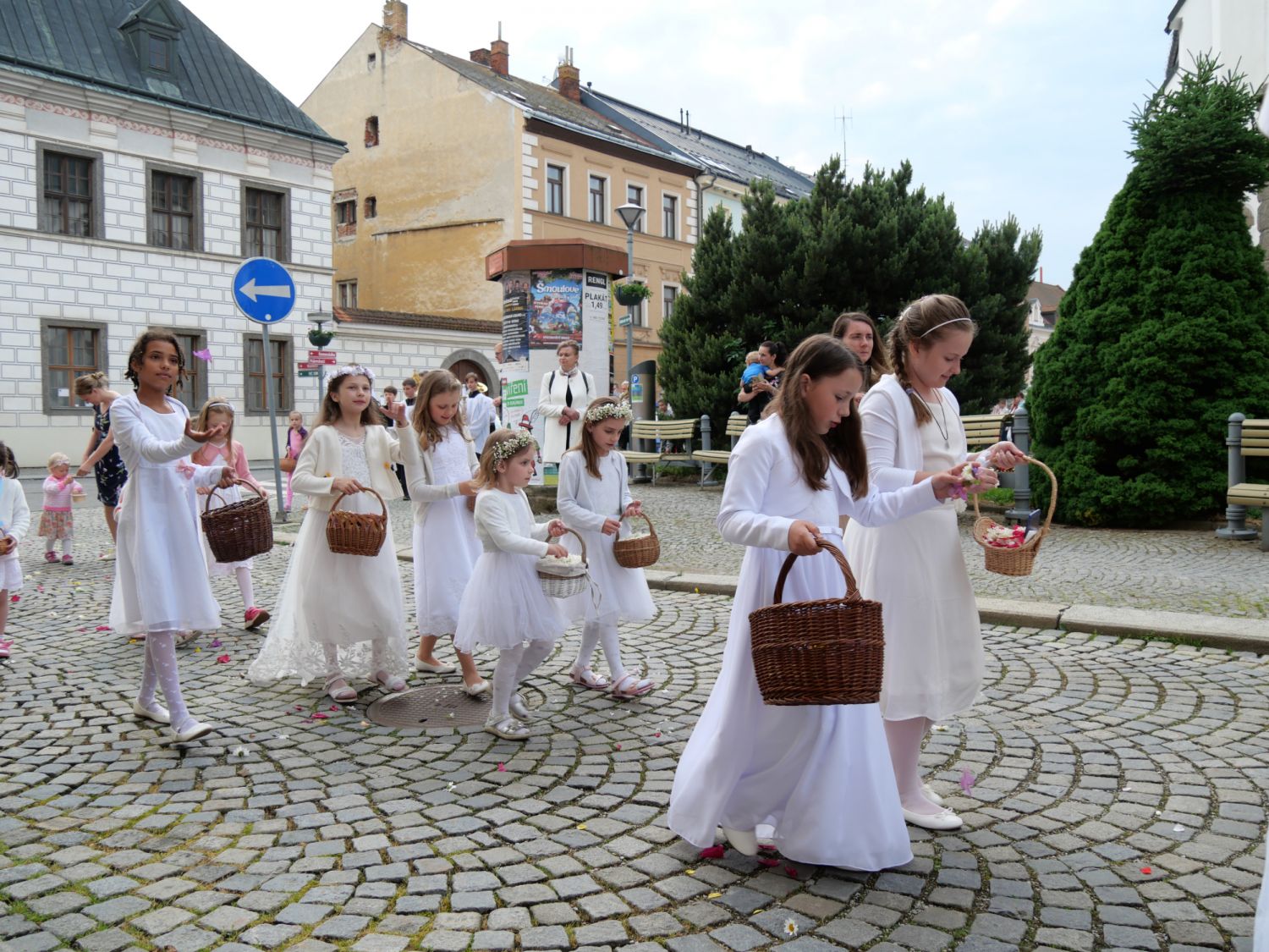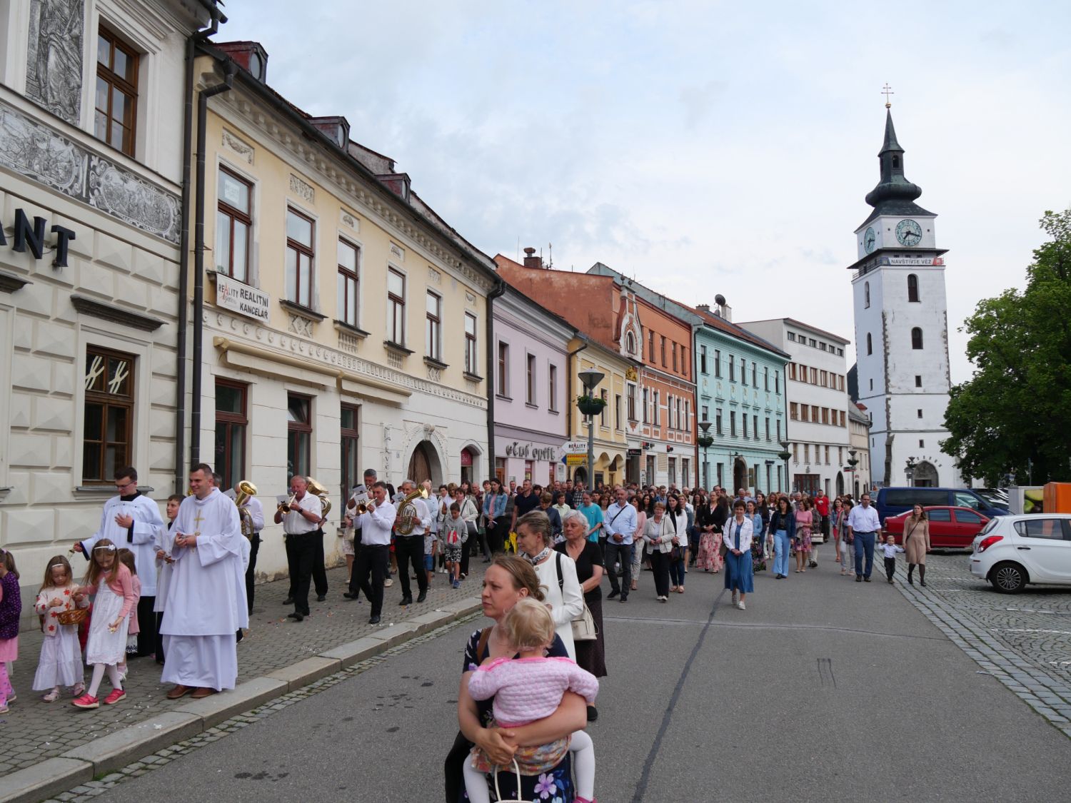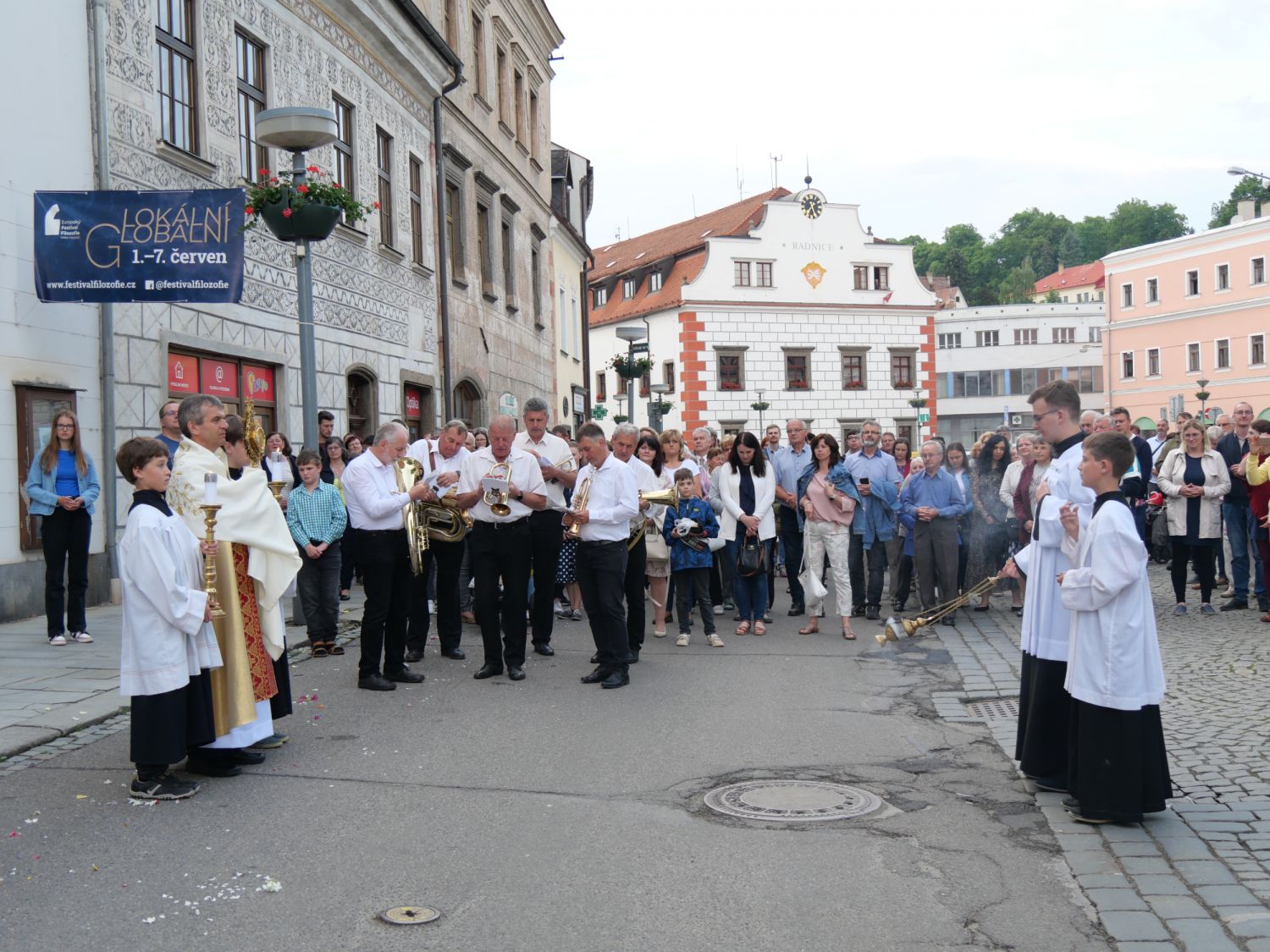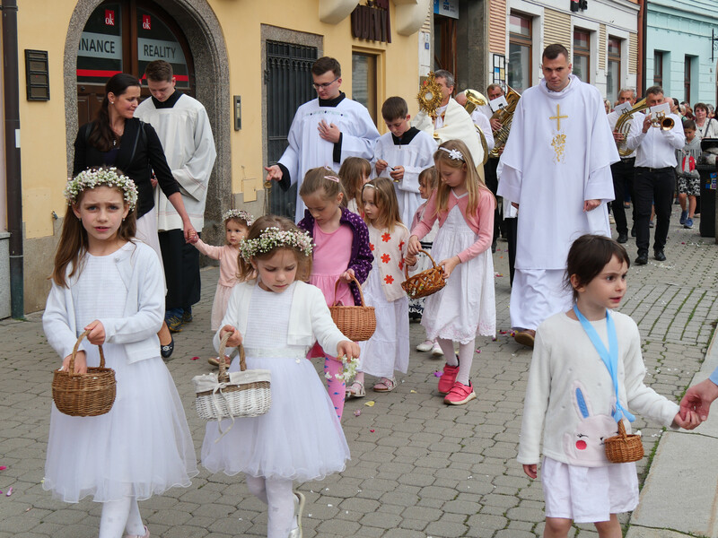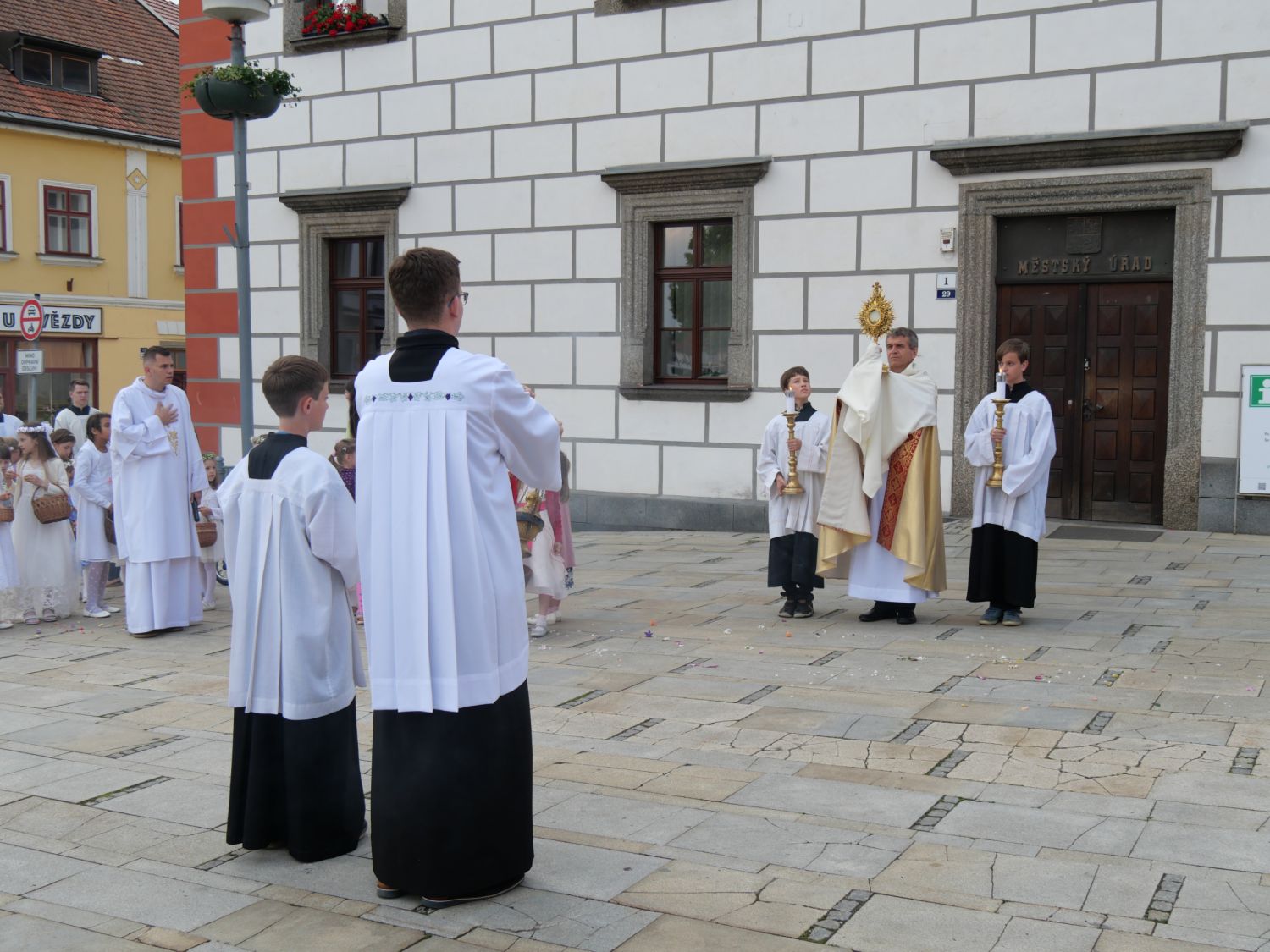 Velkomeziříčská farnost slavila Boží Tělo. Náměstím prošel početný průvod se sedmi zastaveními. Zazněly při nich modlitby a požehnání pro sedm významných oblastí společenského života, a to rodinu, politiku, média, umění, vzdělání, podnikání a církev.