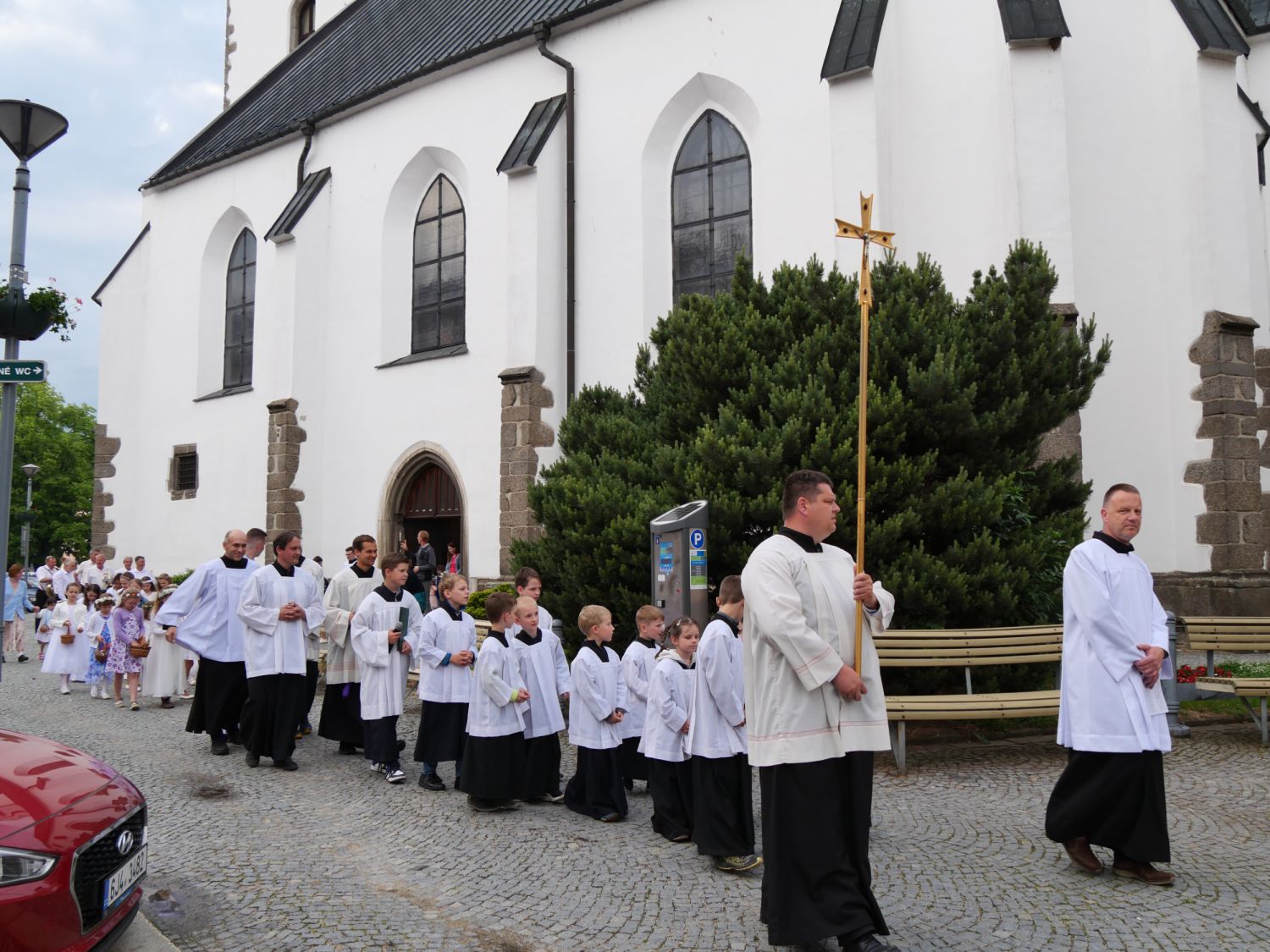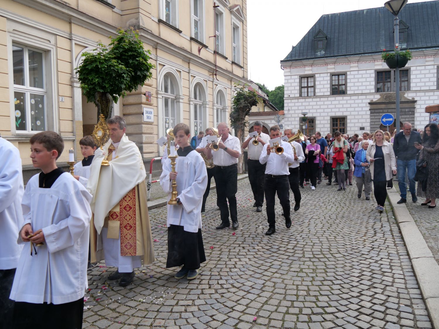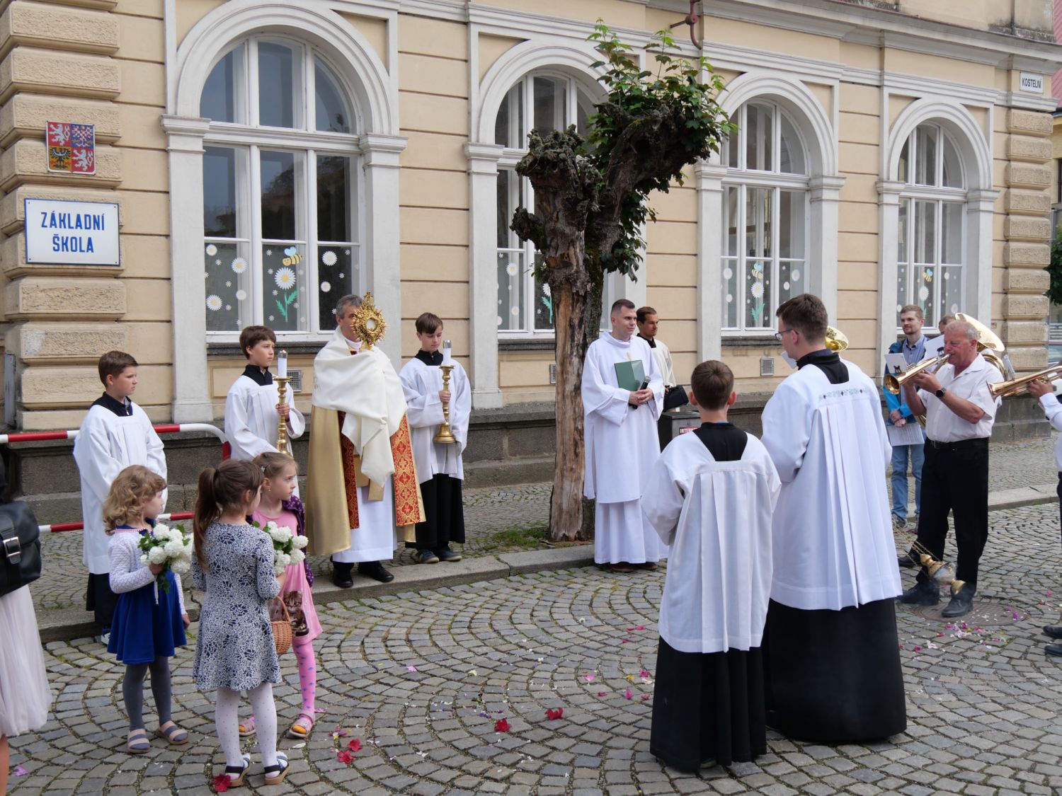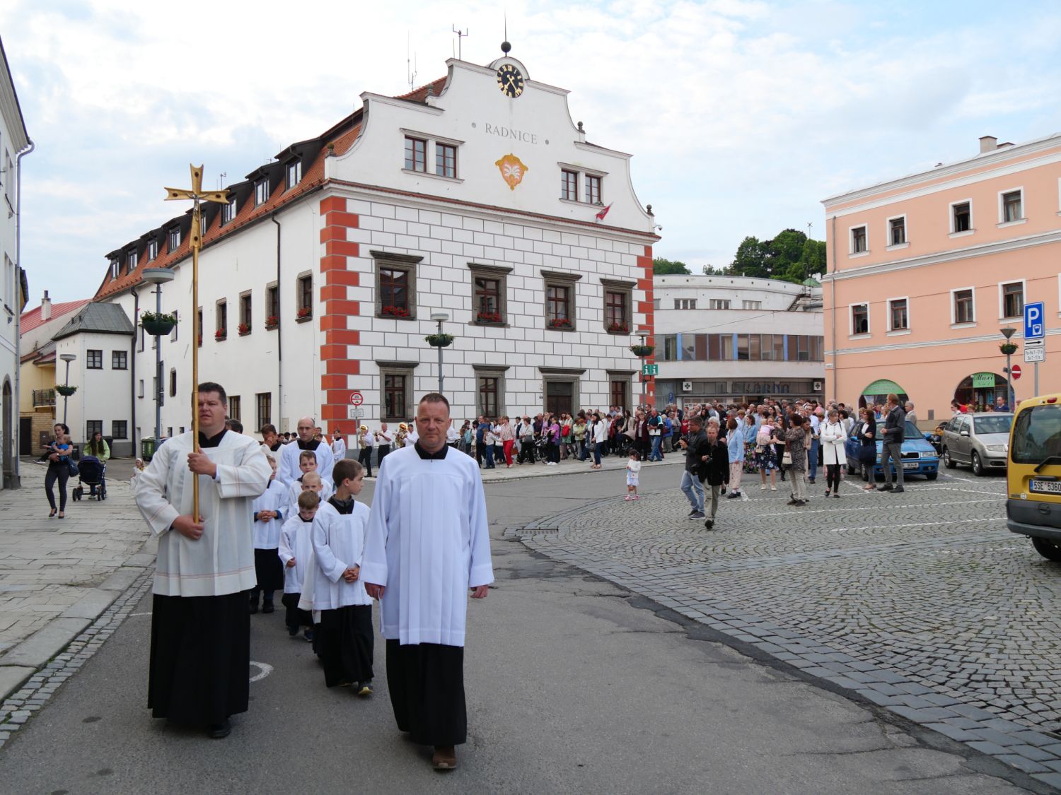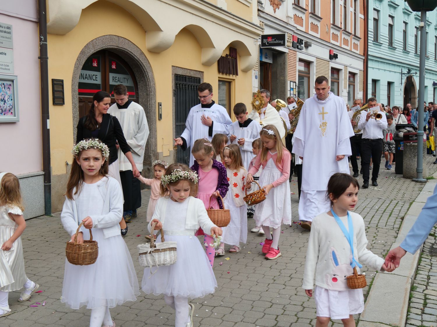 Velkomeziříčská farnost slavila Boží Tělo. Náměstím prošel početný průvod se sedmi zastaveními. Zazněly při nich modlitby a požehnání pro sedm významných oblastí společenského života, a to rodinu, politiku, média, umění, vzdělání, podnikání a církev.