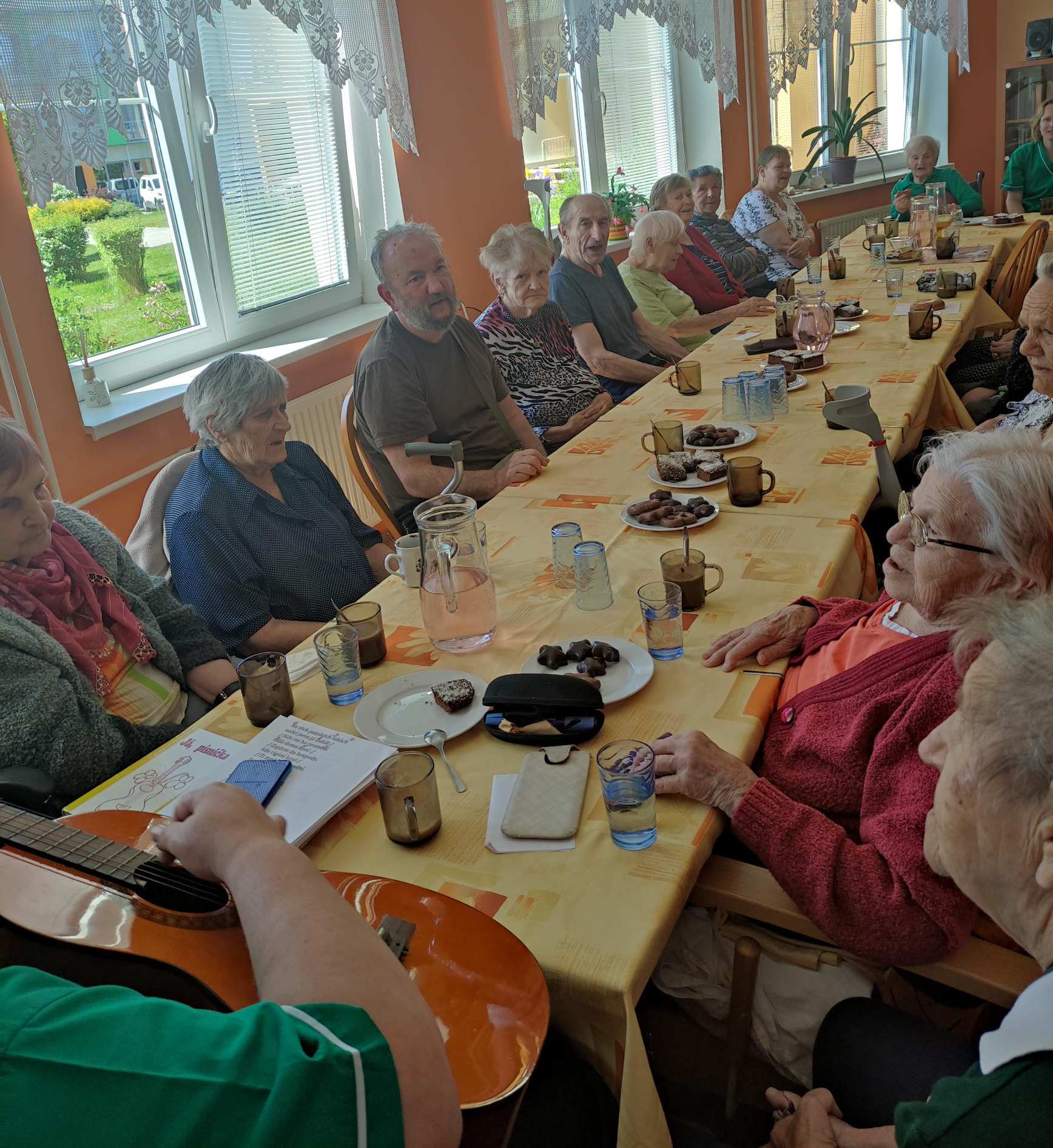 Setkání probíhalo v jídelně našeho domu s pečovatelskou službou a zúčastnilo se ho 20 klientů z obou organizací. Naši sousedé k nám zavítali v doprovodu zaměstnanců Domova pro seniory. Potěšili nás nejen dárkem v podobě kávy a výborné buchty, ale také kytarou, na kterou hrála aktivizační pracovnice.