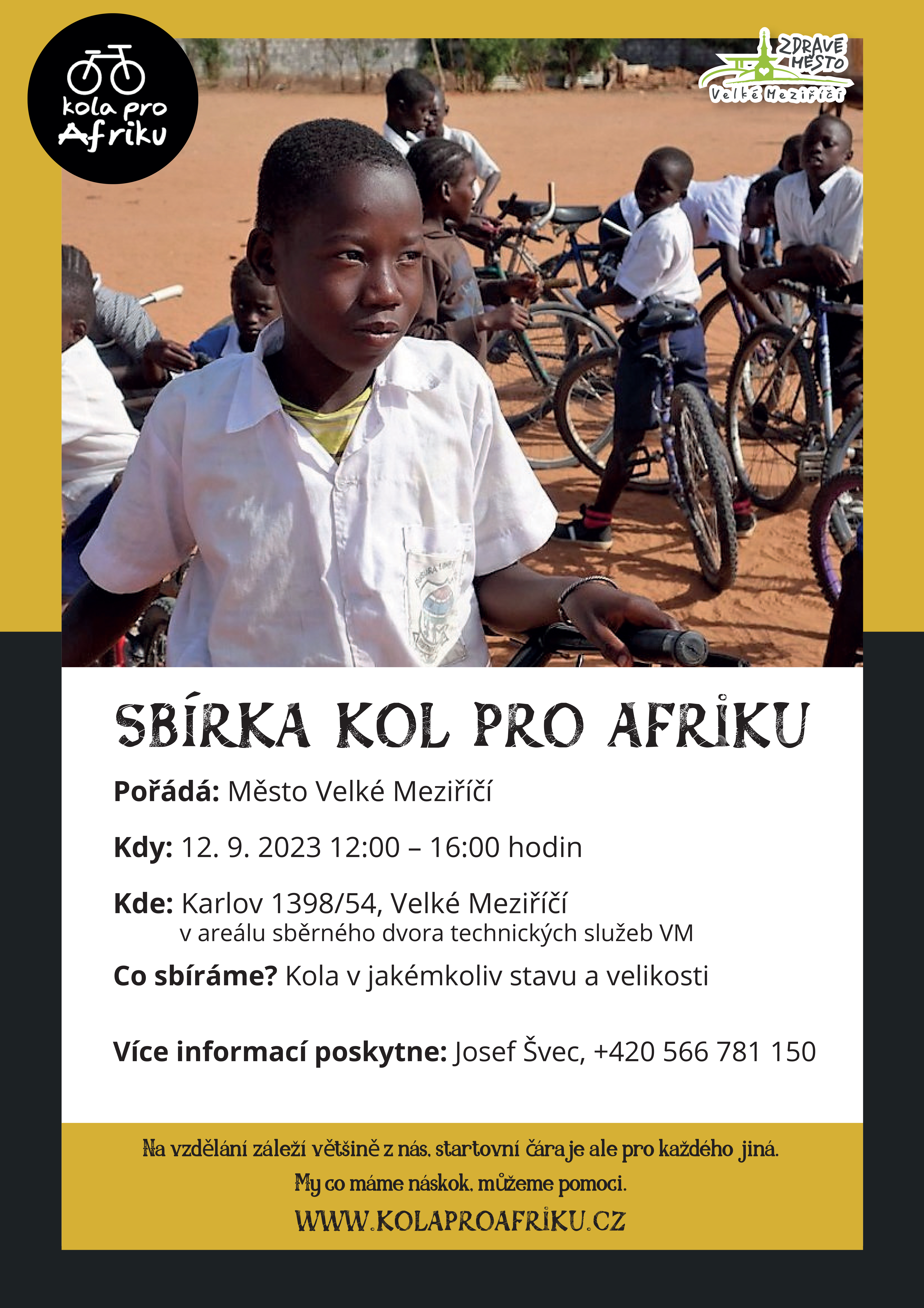 V rámci sbírky Kola pro Afriku pořádanou Zdravým městem Velké Meziříčí máte možnost darovat kola dětem v Africe, a to v jakémkoliv stavu a velikosti.