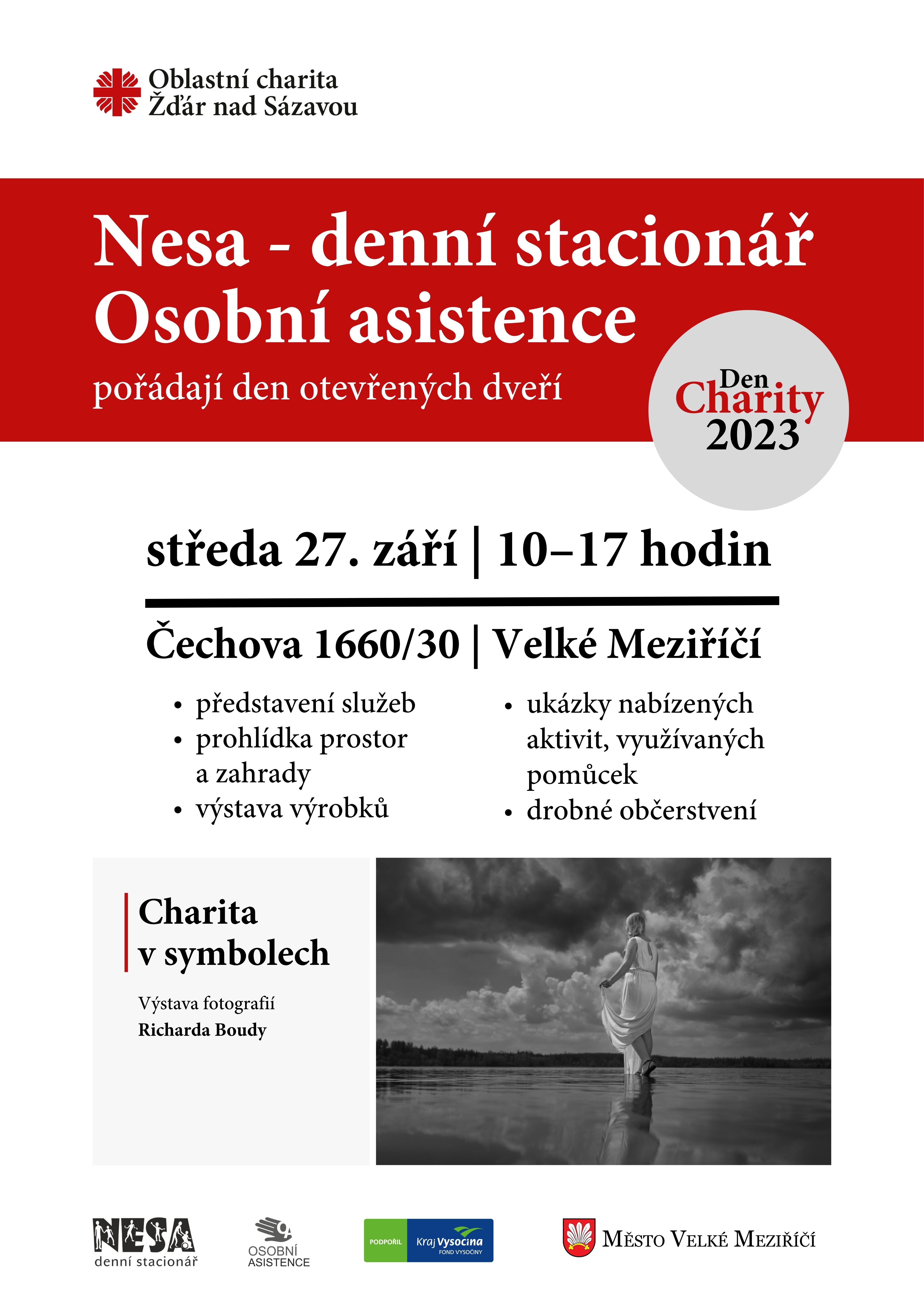 Vedoucí velkomeziříčské Nesy Alena Poulová považuje Den Charity za příležitost veřejnost blíže seznámit se službami denního stacionáře. „S radostí přivítáme každého příchozího, představíme mu nabízené služby i aktivity a pokusíme se přiblížit i běžný život lidí s postižením," řekla Alena Poulová. Den otevřených dveří v Nese obohatí výstava Charita v symbolech fotografa Richarda Boudy. Série černobílých snímků představuje široký záběr pomoci, kterou Charita každodenně lidem přináší.
