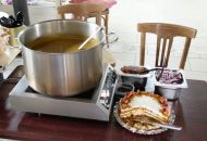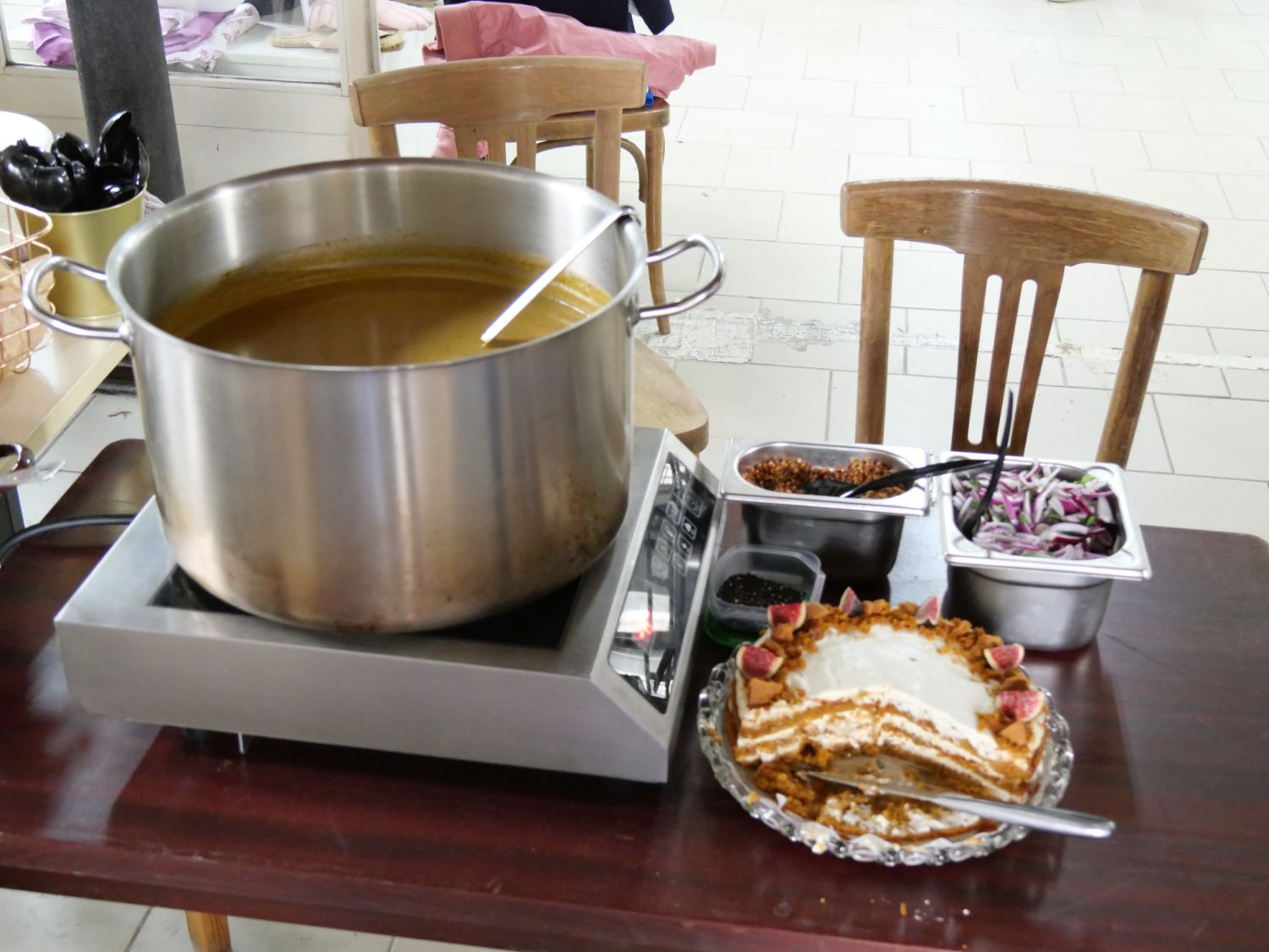 Jako poděkování je pro návštěvníky připraveno i občerstvení. Synagogou voní asijská polévka, lasagne a buřtguláš od Filda cook catering. Nechybí ani něco sladkého, dort z kavárny Termoska.