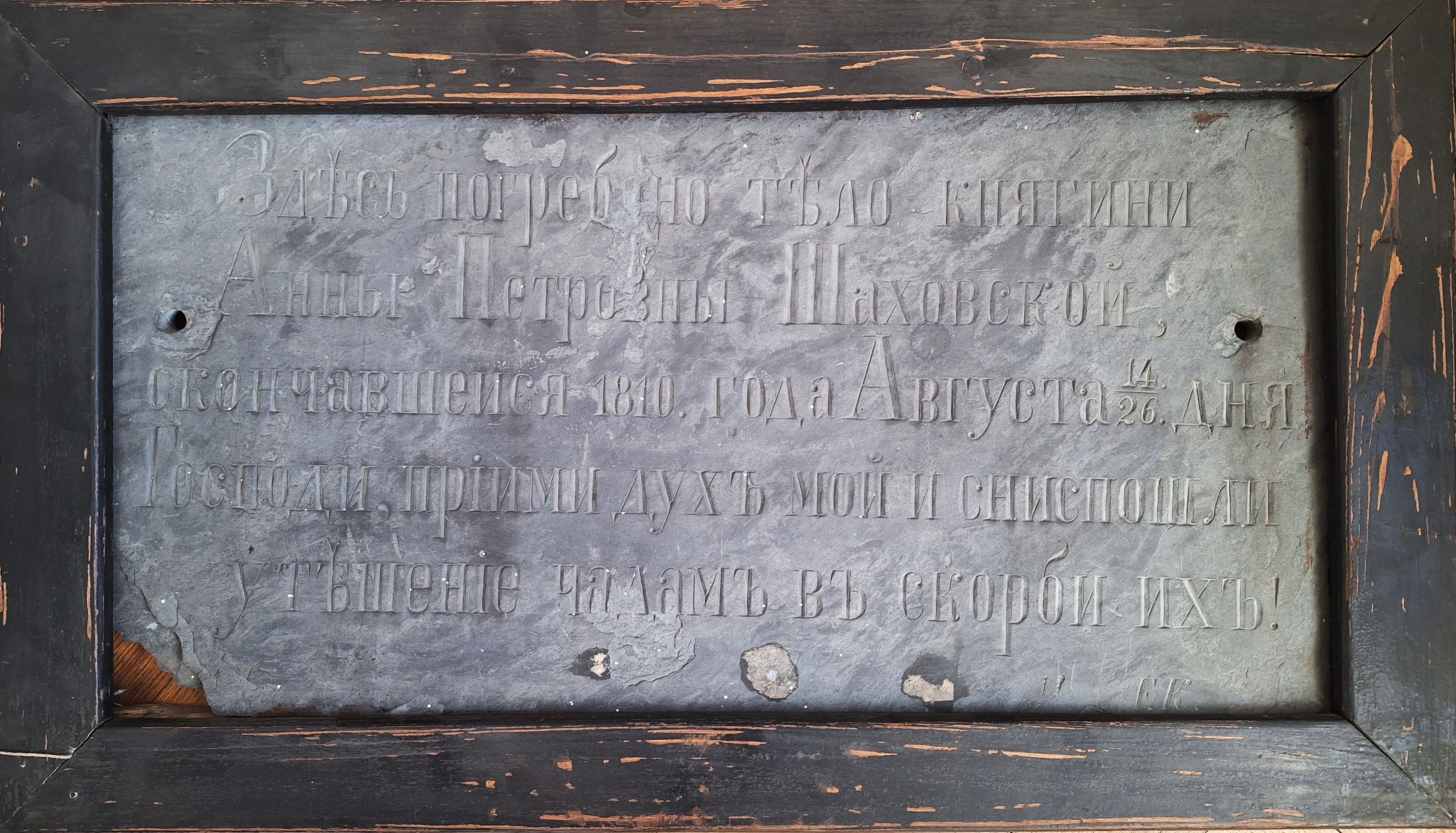 Neobvyklým předmětem je břidlicová deska v dřevěném rámu, která byla původně umístěna u vchodu do kaple na starém hřbitově na Moráni. Deska s rytým nápisem nám připomíná úmrtí ruské princezny Anny Petrovny Šachovské, která ve Velkém Meziříčí skonala 26. srpna 1810 při cestě do vlasti.