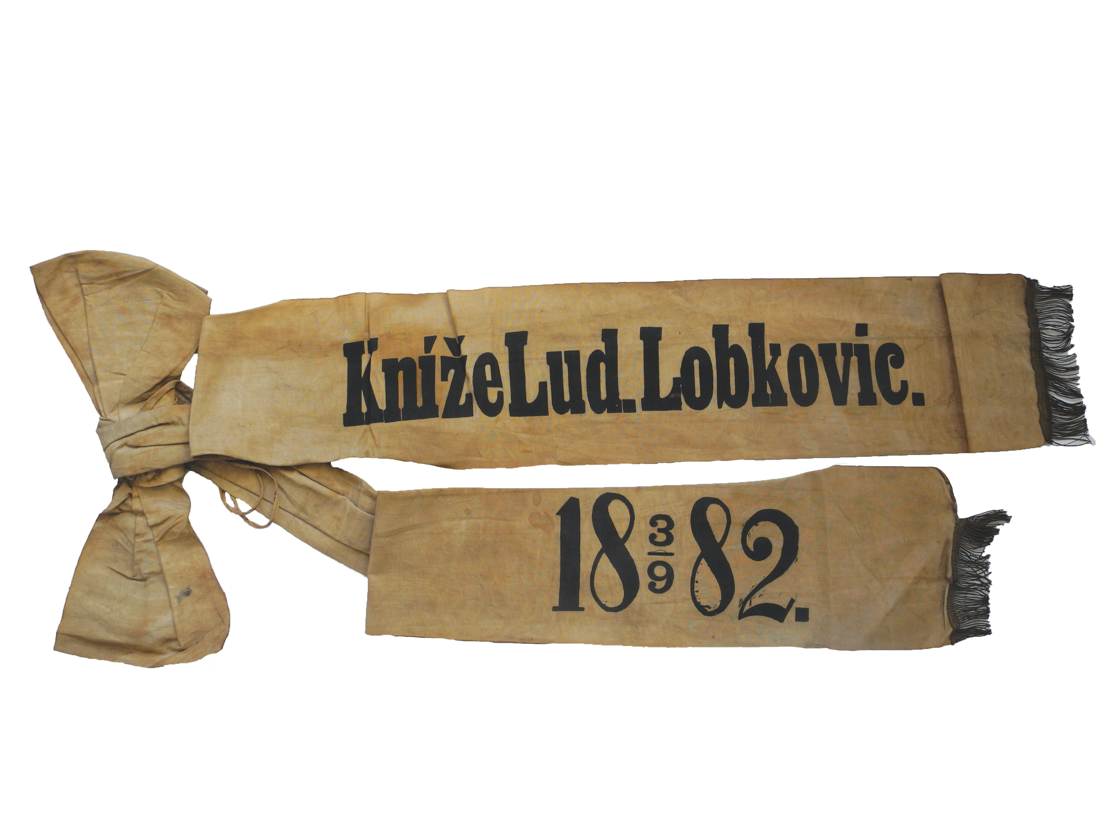 Fotografie z pohřbu manžela Leopoldiny Ludvíka Lobkovice v našem archivu nenalezneme, ale zato máme ve sbírkách uloženou Ludvíkovu pohřební stuhu. Kromě jeho jména je na této rypsové stuze uvedeno datum úmrtí 3. září 1882.