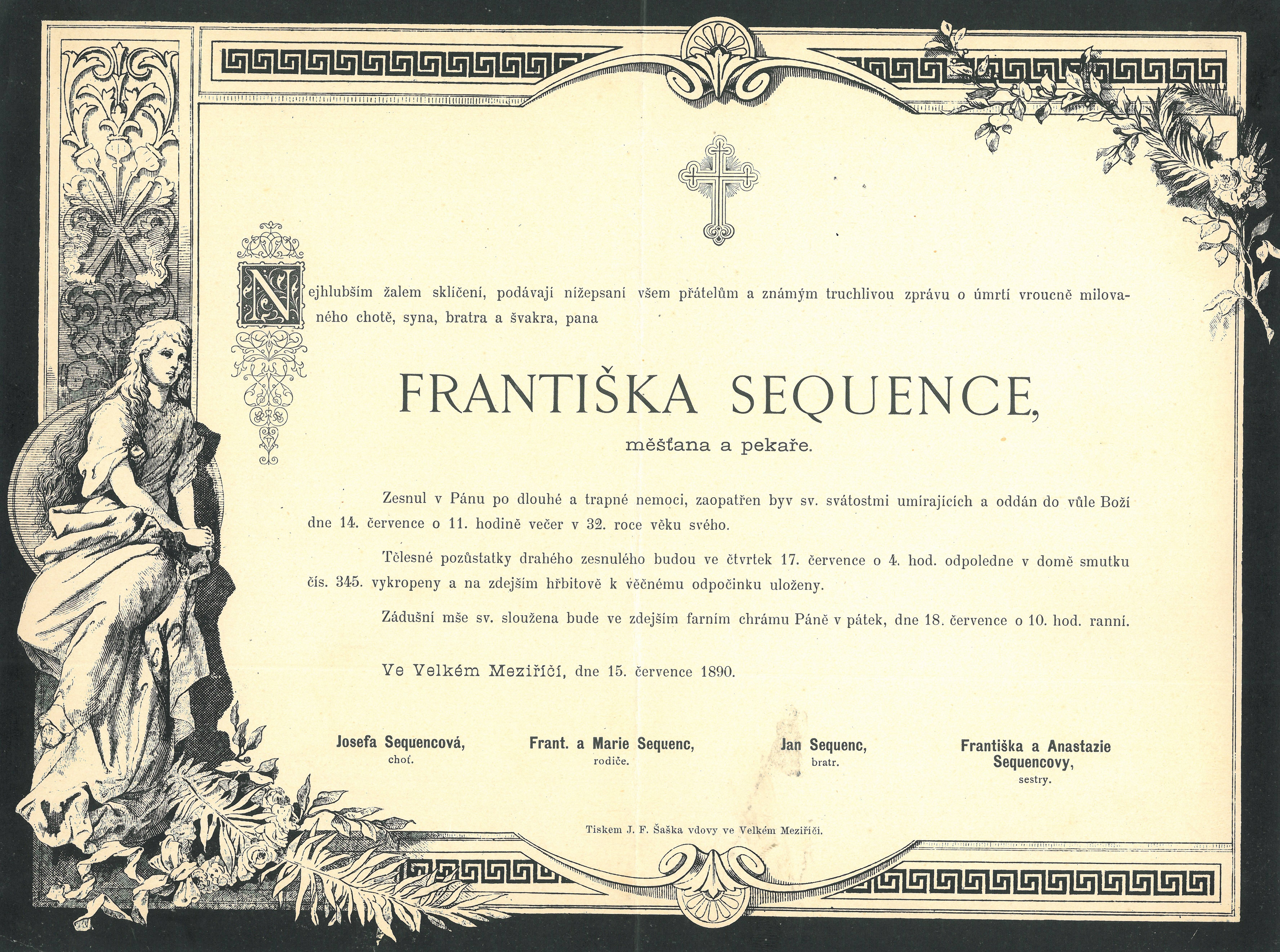 V muzejních archivu nalezneme rozsáhlou sbírku parte čítající přes sedmnáct set exemplářů. Nejstarším oznámením v našem fondu je parte Martina Zwacha, příbuzného velkomeziříčského starosty Aloise Zwacha. Toto parte z vídeňské tiskárny pochází z roku 1862. Po vzniku tiskárny Jana Floriána Šaška ve Velkém Meziříčí pak došlo k většímu rozvoji tohoto typu oznámení, přičemž nejstarší parte v našich sbírkách právě z této tiskárny pocházejí z roku 1880. Smuteční oznámení z konce 19. století zahrnují především ředitele škol a učitele, panské a státní zaměstnance a starosty, ale také řemeslníky, obchodníky či hostinské. Nejhojněji je zastoupeno období první poloviny minulého století, díky čemuž se zde objevují oznámení o úmrtí obyvatel napříč různými sociálními skupinami.