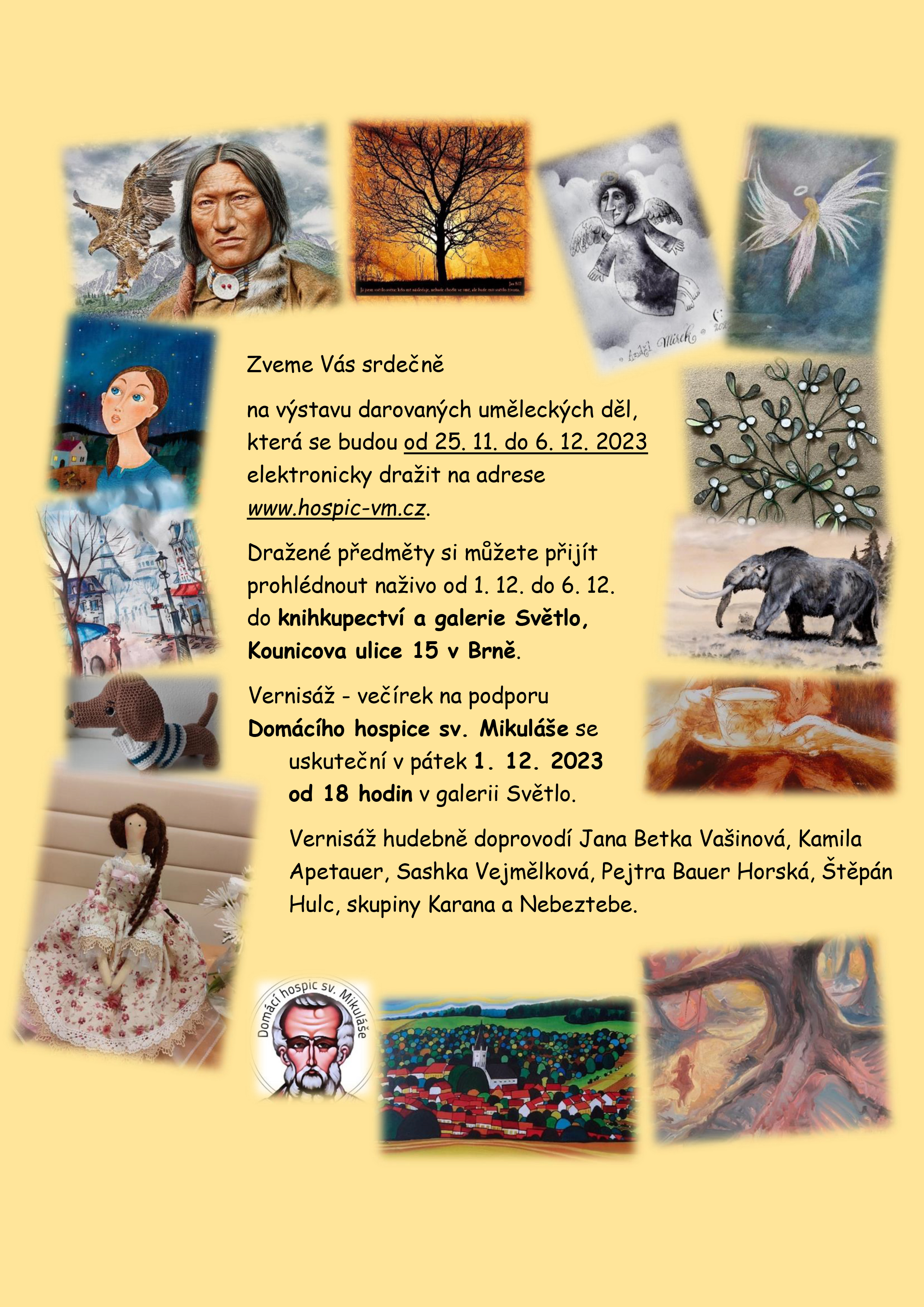 1. prosince od 18:00 hodin v knihkupectví probíhá také vernisáž neboli večírek na podporu hospice. Hudebním doprovodem na akci bude Jana Betka Vašinová, Kamila Apetauer, Sashka Vejmělková, Pejtra Bauer Horská, Štěpán Hulc, skupiny Karana a Nebeztebe.