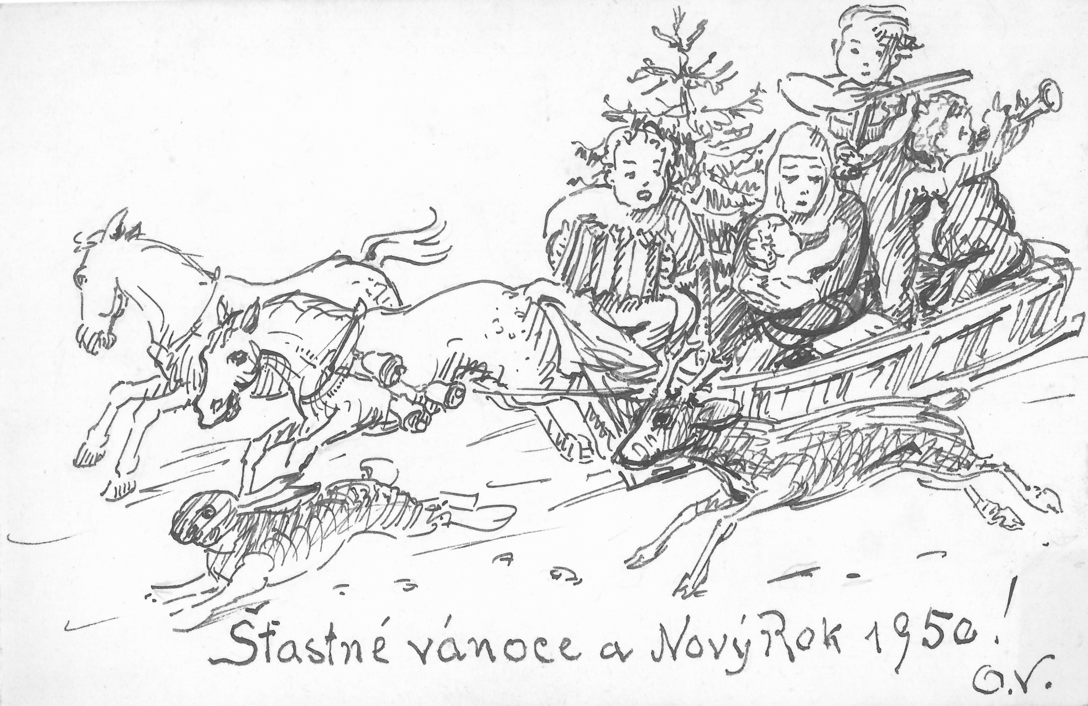 Vánoční přání nemusejí mít pouze podobu předtištěné pohlednice, ale mohou být i originálním dílem, jako je tomu v případě listu uloženého ve fondu Zdenky Vorlové Vlčkové. Samotný obrázek autor doplnil přáním šťastných Vánoc a nového roku 1950.