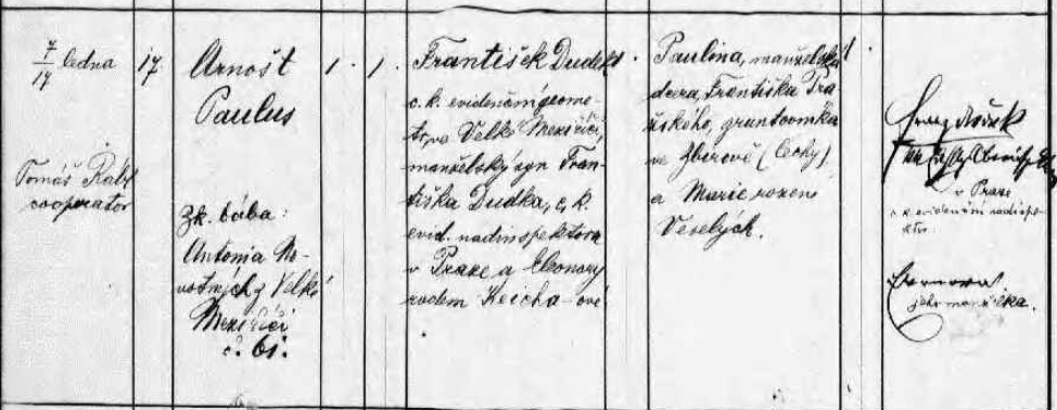 Arnošt Paulus Dudek se ve Velkém Meziříčí narodil 7. ledna 1892 v domě číslo popisné 17. Byl synem c. k. geometra ve Velkém Meziříčí Františka Dudka, jenž byl synem c. k. nadinspektora v Praze Františka Dudka a jeho ženy Eleonory rozené Keichové. Matkou Arnošta byla Paulina, dcera gruntovníka ve Zbirohu Františka Pražského a jeho ženy Marie rozené Veselé. Žil v Praze, ale do války rukoval z Přerova.