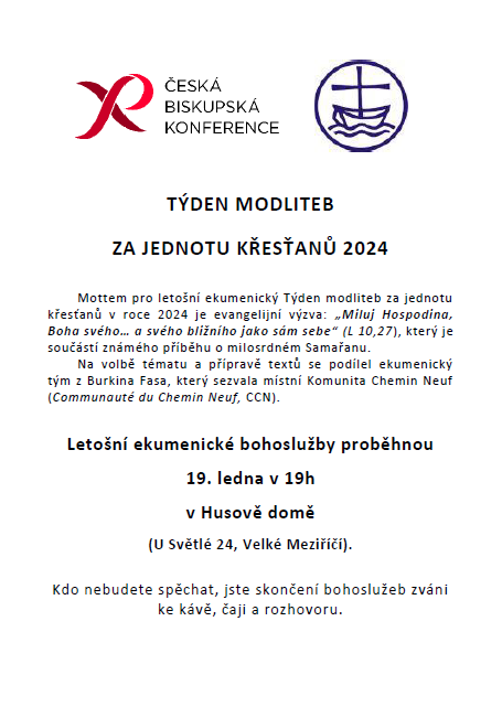 Ekumenické bohoslužby v rámci týdne modliteb za jednotu křesťanů (TM) se uskuteční v pátek 19. ledna od 19 hodin v Husově domě. Mottem letošního TM je evangelijní výzva Miluj Hospodina, Boha svého...a svého bližního jako sám sebe.