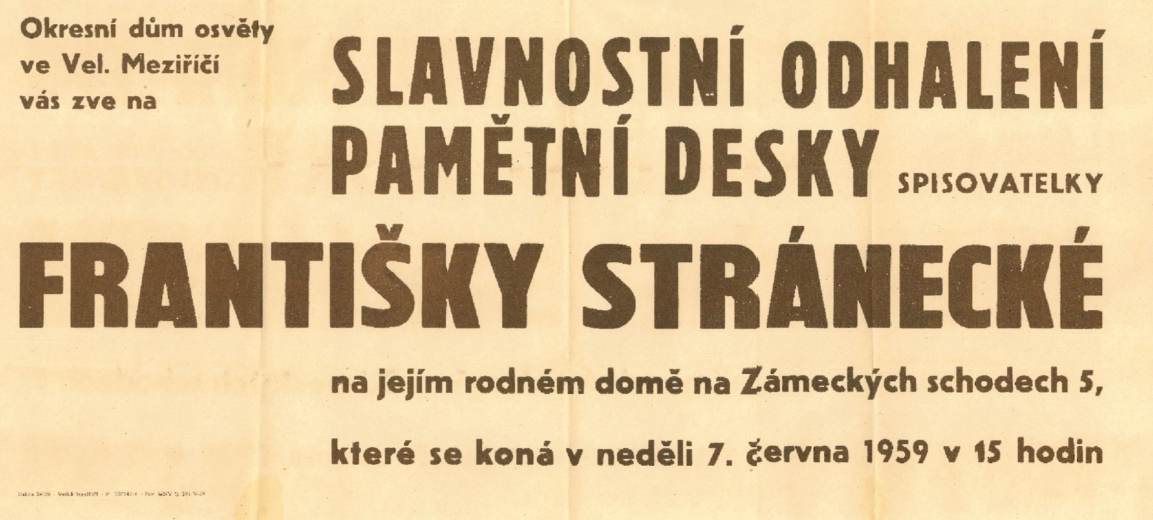 Na připomínce Františky Stránecké se koncem 50. let minulého století velkou měrou podílela tehdejší ředitelka velkomeziříčského muzea Marie Benešová. Díky ní se v archivu dochovala řada materiálů týkajících se přípravy pamětní desky ke 120. výročí narození. Samotné odhalení se uskutečnilo v neděli 7. června 1959 a v archivu kromě pozvánky s programem a plakátu nalezneme třeba i podepsaný strojopis básně od Ladislava Dvořáka „Oslava", která byla během slavnostního odpoledne odrecitována. Dochována je také korespondence se spisovatelčiným vnukem Bohumírem Remešem či autorem pamětní desky akademickým sochařem Josefem Klimešem, rodákem z nedalekého Měřína.
