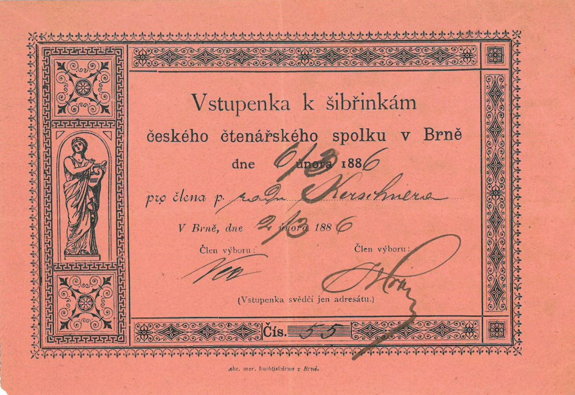 Na druhou stranu jsou v muzeu uloženy i materiály osobnějšího rázu, kam můžeme zařadit fotografie rodičů, dětí, úmrtní oznámení manžela Ignáta Kerschnera nebo třeba vstupenku z března 1886 na šibřinky českého čtenářského spolku v Brně.