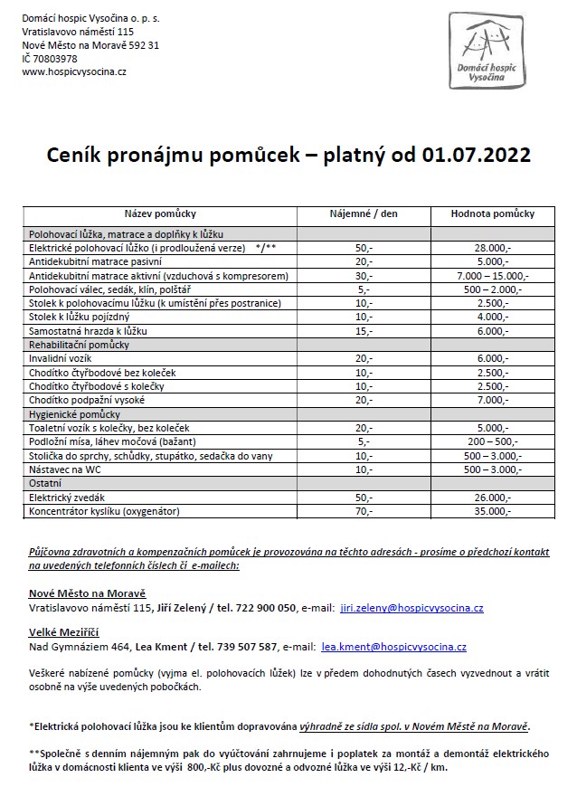 Kontakty na půjčovnu pomůcek Domácího hospice Vysočina: