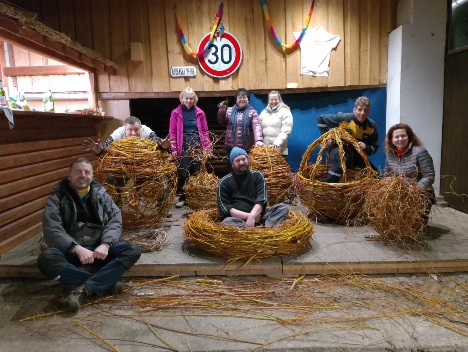 Díky štědrosti obyvatel jsme získali velké množství materiálu prutů z klasické i ze smuteční vrby, což byl hlavní materiál pro naši tvorbu. Vše nám šlo lépe díky šikovnému místnímu svářeči, který nám vyrobil potřebné kovové konstrukce. Do vlastního pletení kraslic a věnce se zapojilo osm dospěláků. Po přemístění výtvorů na náves už zbývalo jen dozdobit vše zelení, osázet maceškami. Nastal úkol pro naše děti a žáky z místní školy, kteří pomalovali polotovary z polystyrenu a výsledkem toho byla rozmanitá velikonoční vajíčka, které jsme společnými silami umístili nejen na velikonoční strom, ale i do proutěného koše.