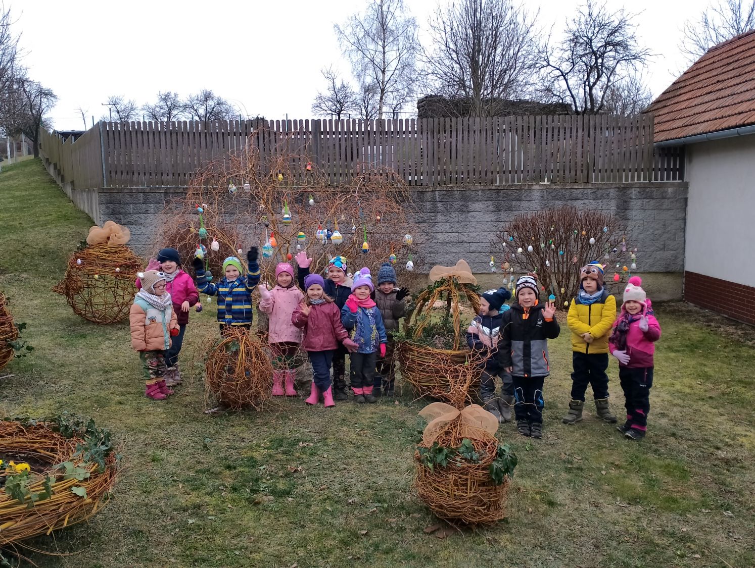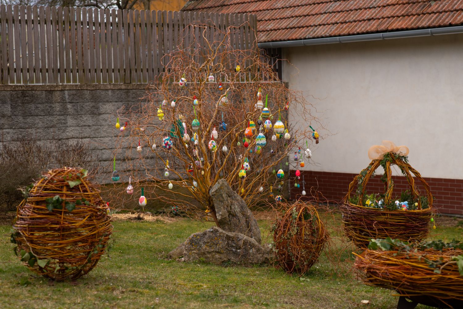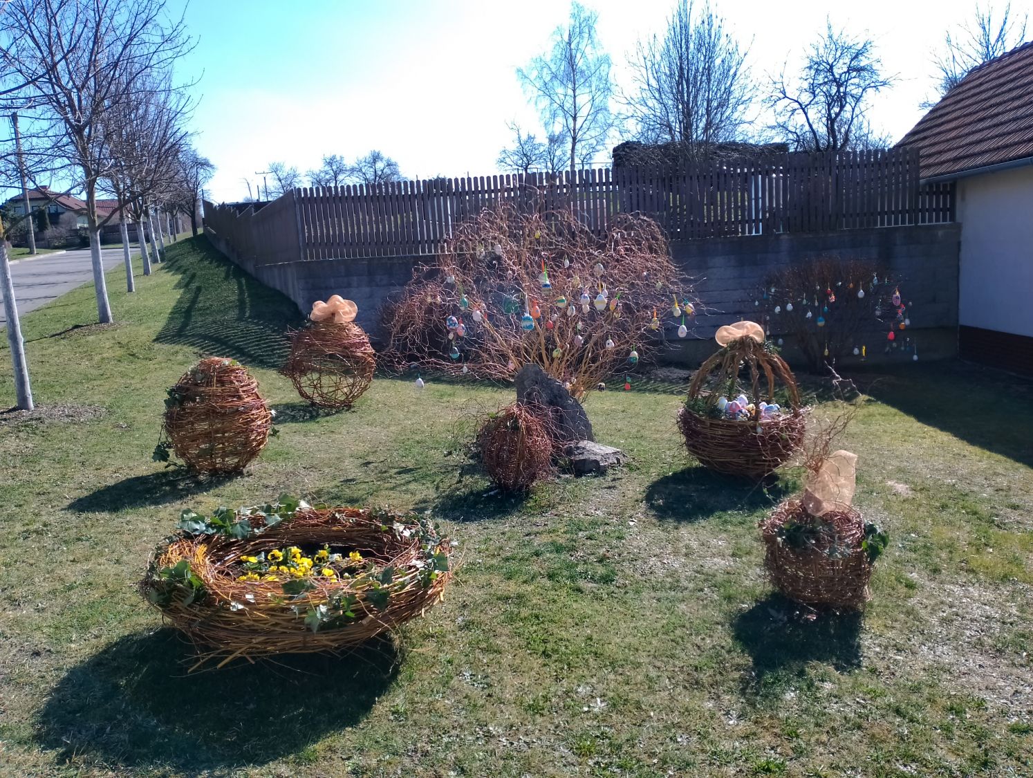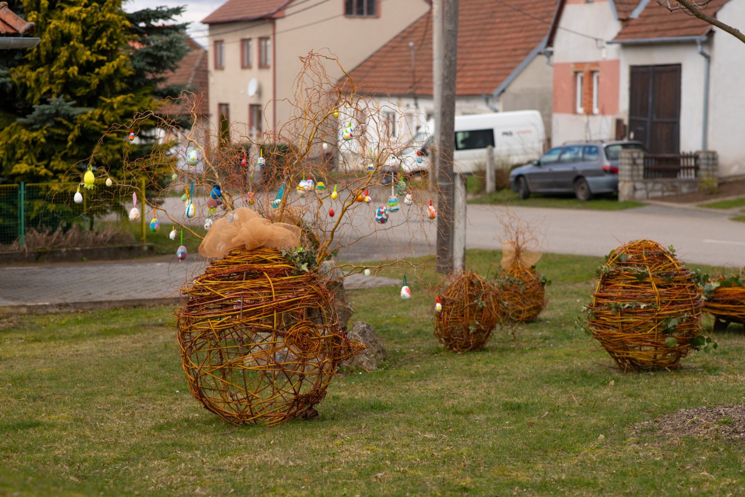 Předchozí roky jsme zavedli tradici velikonočního stromu se zavěšenými kraslicemi od obyvatel, dětí a žáků z místní školky. Letos jsme se inspirovali výzdobou z jižní Moravy, kde jsme viděli velké proutěné a také malované polystyrenové kraslice. Tento nápad se nám velice líbil.