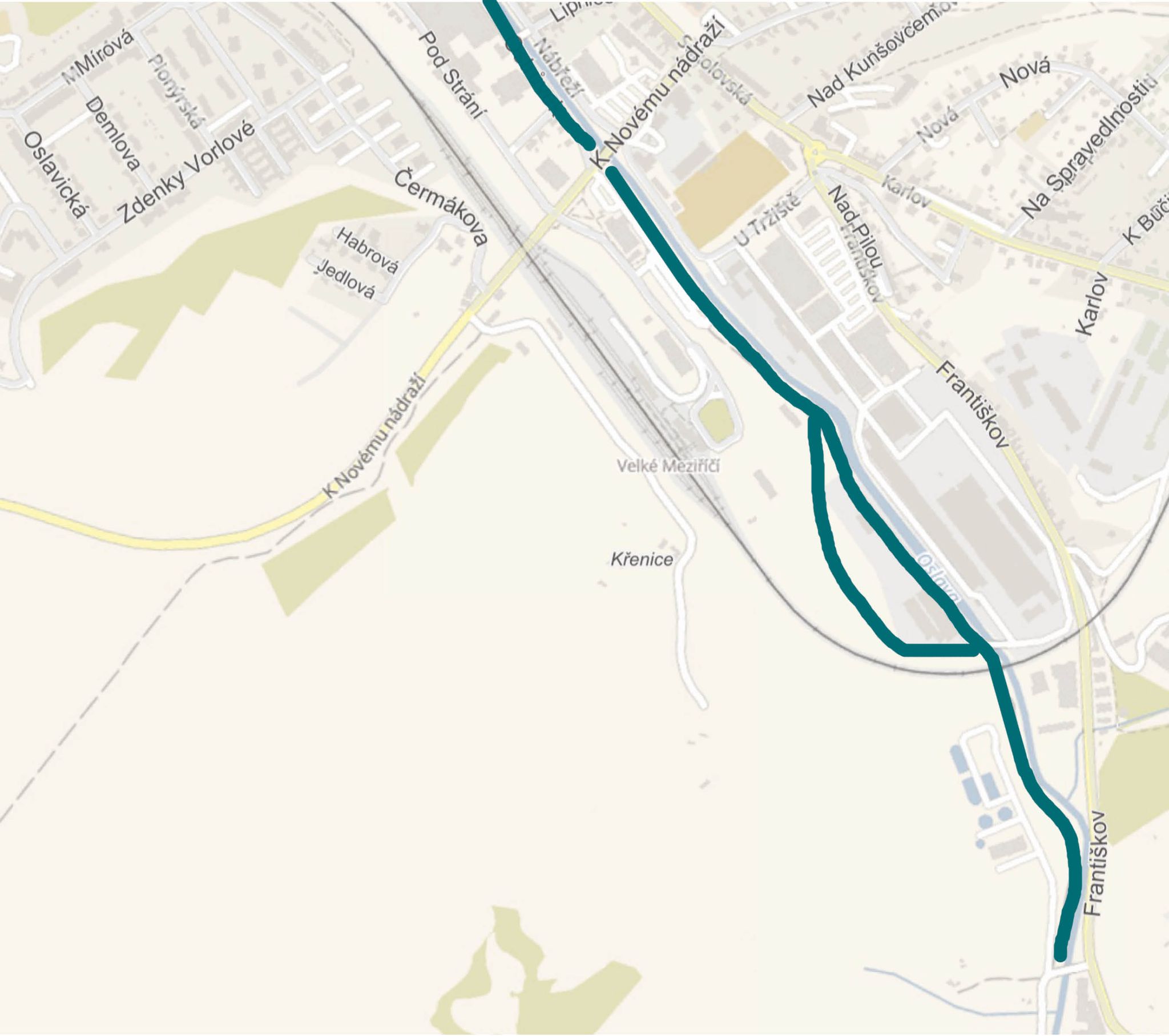 Cyklisté jsou v současnosti vedeni kolem Kauflandu a přes Františkov, což není nijak příjemné ani bezpečné. Snahou města je nalézt bezpečnější cestu podél pravého břehu řeky Oslavy. Je zadána vyhledávací studie úseku od starého Penny po Nesměřské údolí, která budou podkladem pro jednání majiteli a firmami, zejména s firmou NKT.
