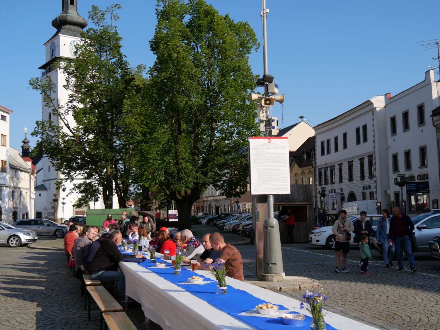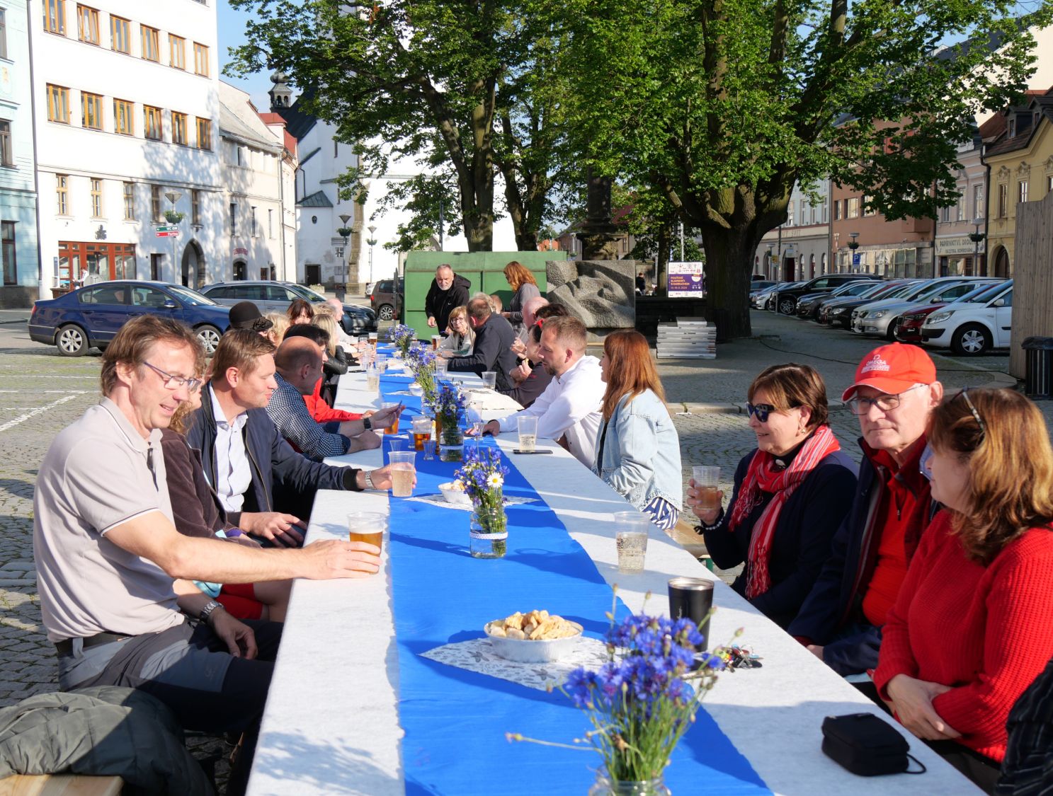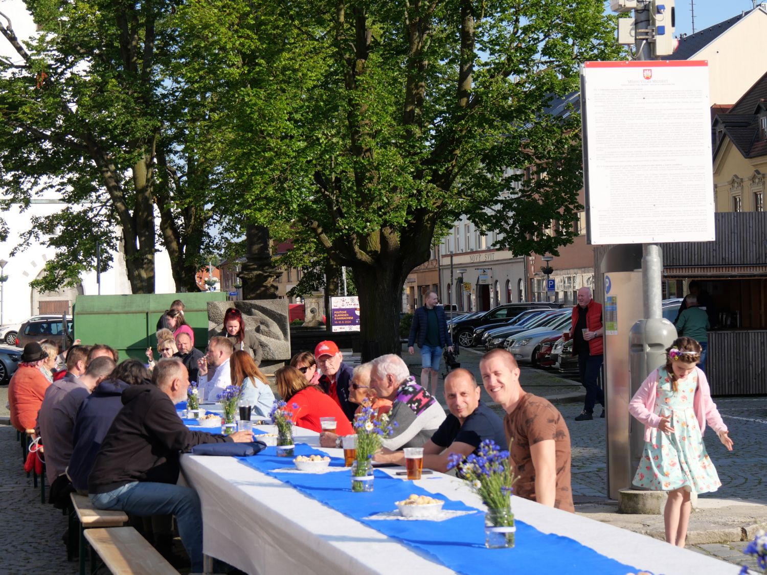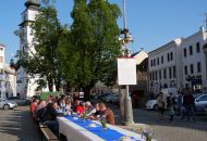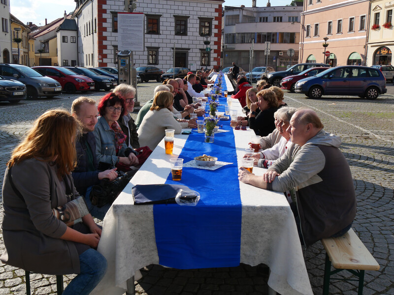 U dlouhého stolu vprostřed náměstí se sešli ve středu v podvečer návštěvníci filozofického festivalu, který letos probíhal od 4. do 12. června vesměs v Jupiter clubu a nové synagoze. Lidé přijali výzvu ředitele festivalu Milana Dufka, aby přišli ukázat, zda vůbec stále ještě umí komunikovat z očí do očí. A tak spolu všichni mluvili o festivalu, umělé inteligenci, přirozeném a umělém a taky o všem možném, co je napadlo. Zvládli to s přehledem a předvedli, že Velkomeziříčským komunikace „naživo“ cizí není. Ostatně to dokázali i v diskusi po přednáškách, kdy sypali na hosty jednu otázku za druhou. Potvrdili tak, co zmínil na afterparty místostarosta Martin Kaman: „Letošní téma bylo velmi zajímavé, dotýká se každého z nás, ať je mladý nebo starší.“