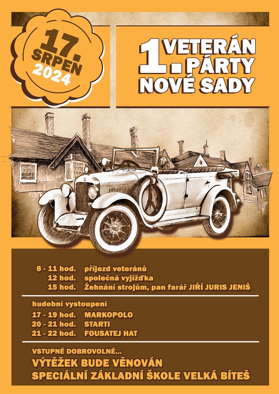 V sobotu 17. srpna od 8 hodin se uskuteční 1. veterán párty Nové sady. Na programu bude společná vyjížďka, žehnání autům farářem či hudební vystoupení. Přesné časy jednotlivých bodů programu naleznete níže na plakátu.