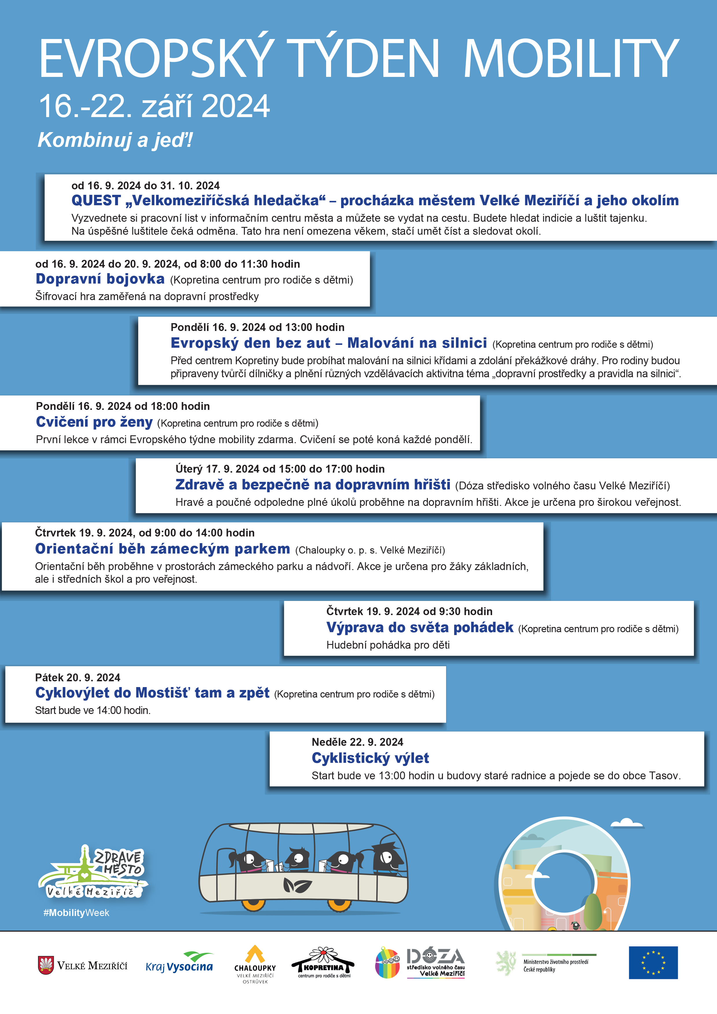 Během každoroční akce Evropský týden mobility si můžete vybrat z bohatého programu. V nabídce bude šifrovací hra, dopravní bojovka, malování na silnici, cvičení pro ženy, soutěže na dopravním hřišti, orientační běh, výprava do světa pohádek či dva cyklovýlety.