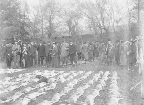 Kromě trojrozměrných předmětů jsou součástí našich sbírek také historické fotografie. Na jedné z nich je zachycen myslivecký spolek ve 20. letech minulého století na nádvoří velkomeziříčského zámku. Další z fotografií pak pochází z 21. října 1904 z nedalekých Martinic. Na ní si můžeme prohlédnout majitele zámku Rudolfa Lobkovice, jeho choť Frederiku či rakousko‑uherského politika Ottu Serényiho, který byl švagrem Františka Harracha.