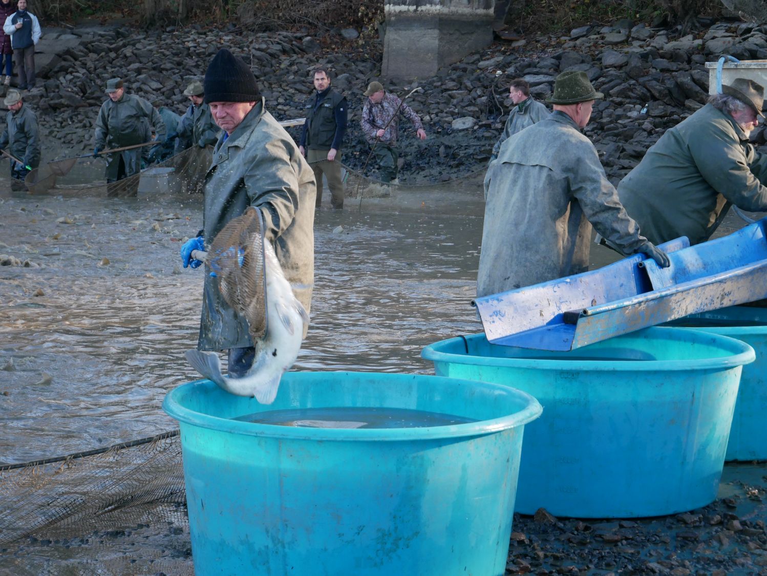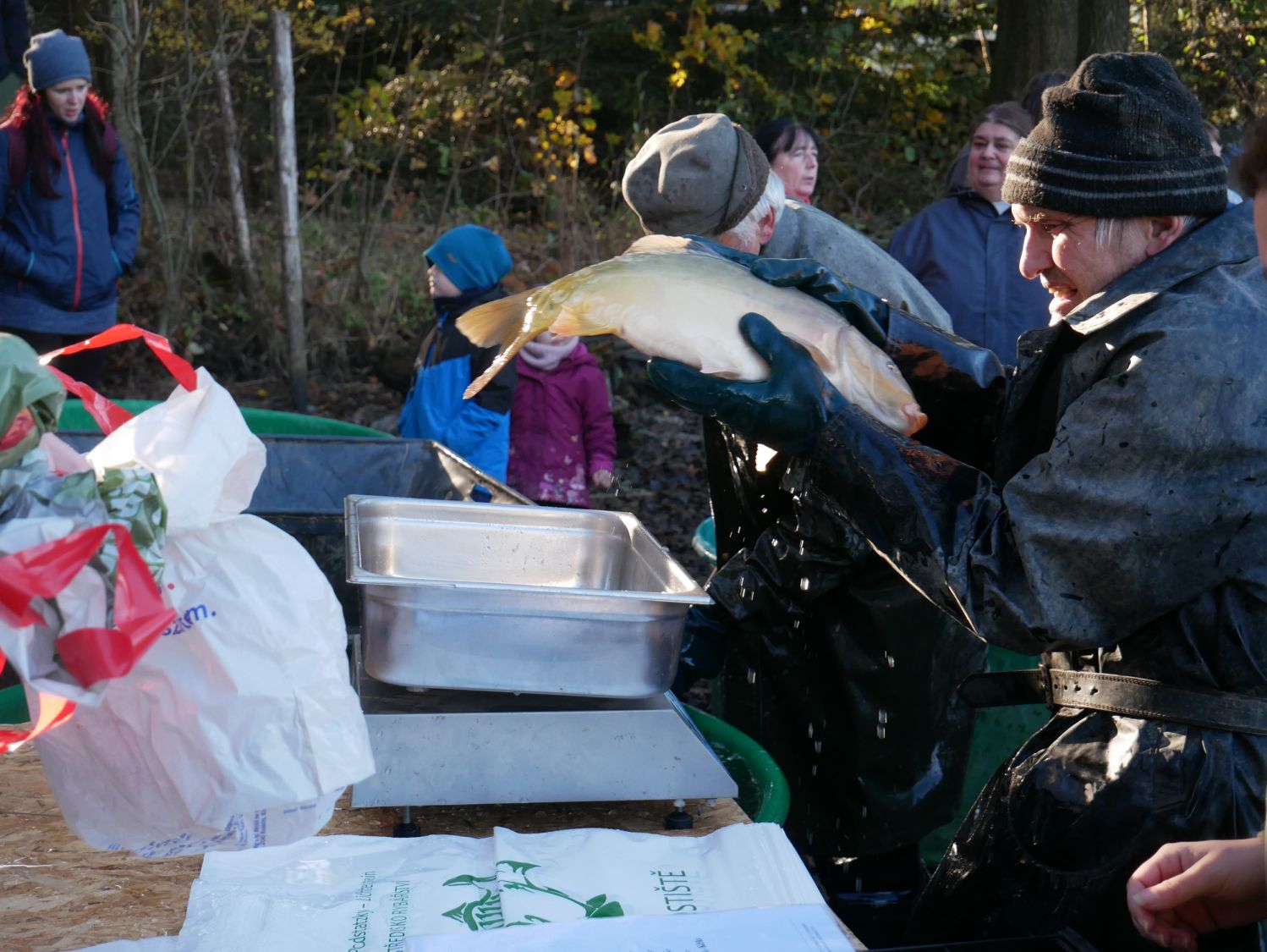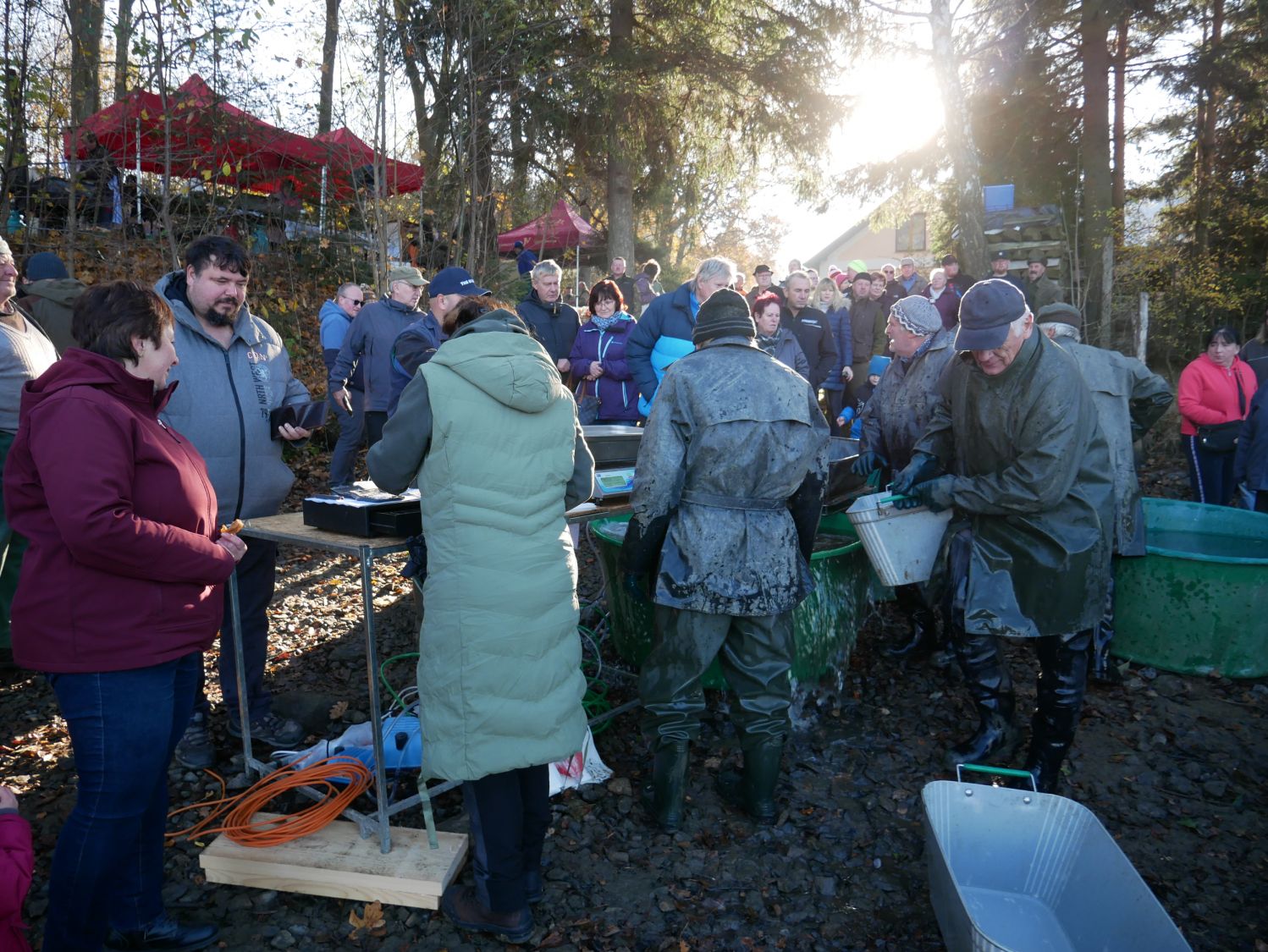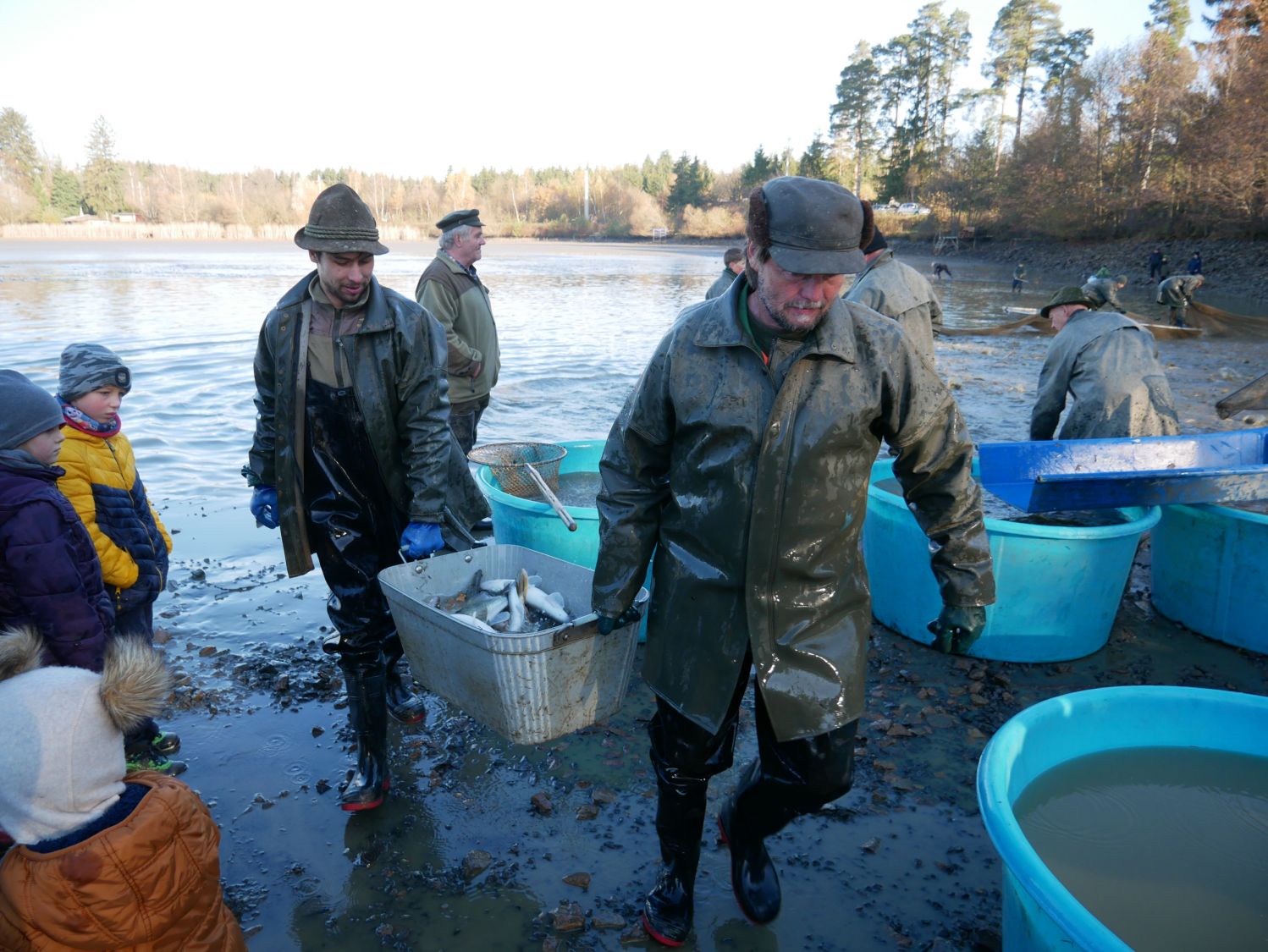 Už od rozbřesku bylo na hrázi rybníka živo. Rybáři chytali vše potřebné a diváci se pomalu shromažďovali u stánků a mrazivé ráno si zpříjemňovali horkými nápoji či rybími specialitami.