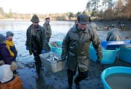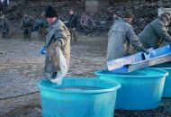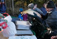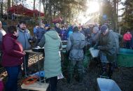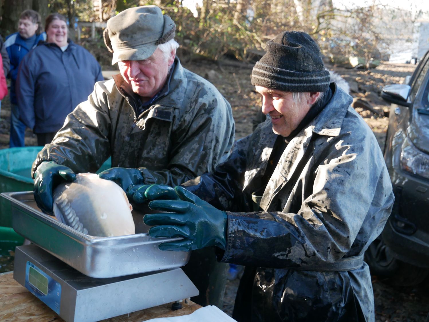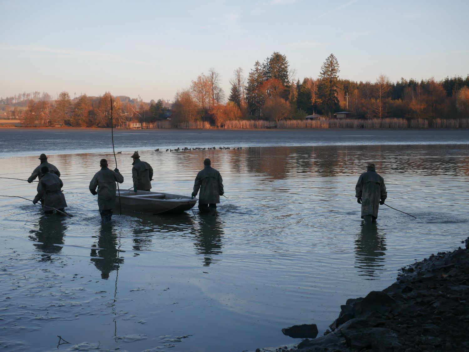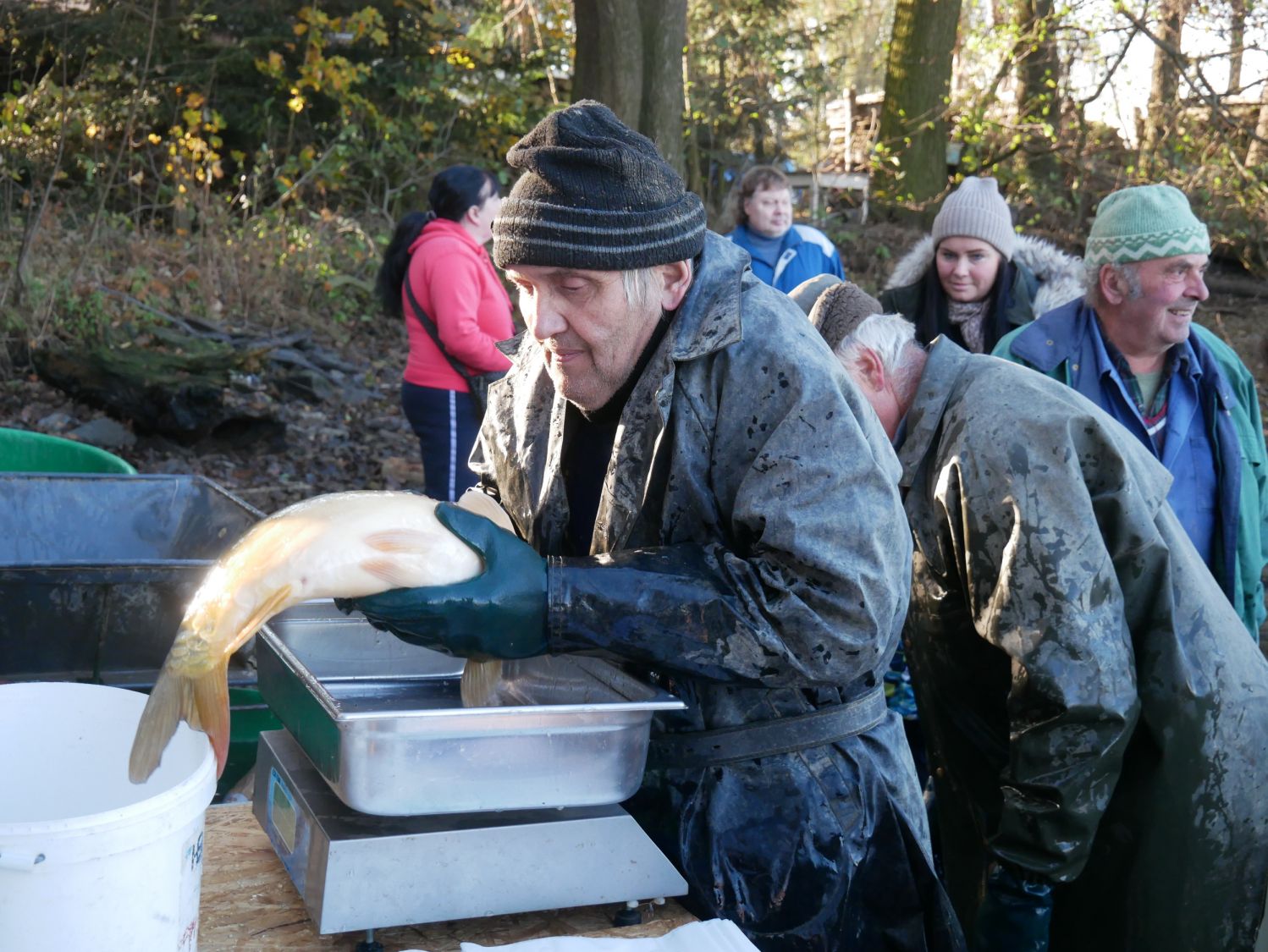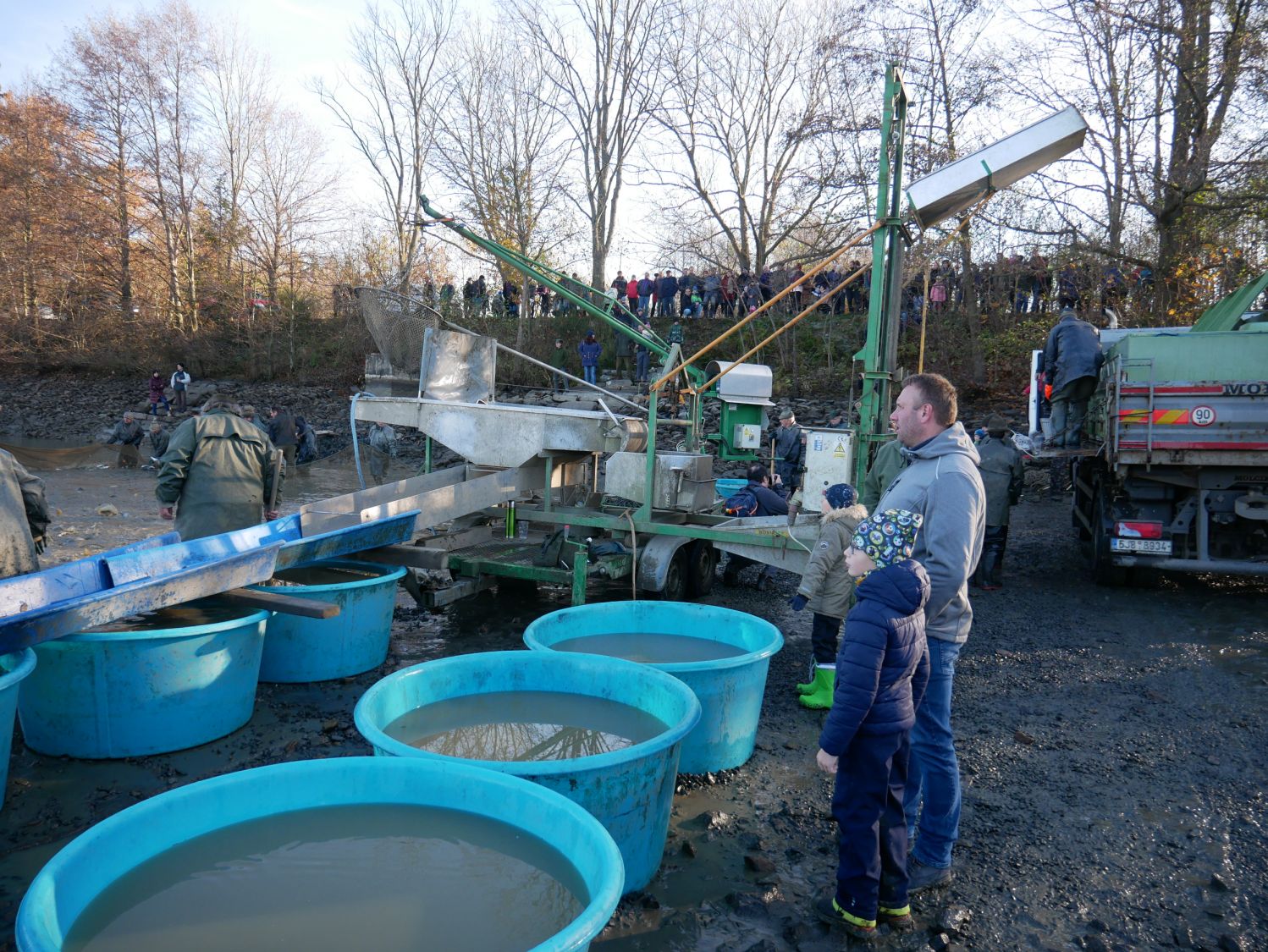 Už od rozbřesku bylo na hrázi rybníka živo. Rybáři chytali vše potřebné a diváci se pomalu shromažďovali u stánků a mrazivé ráno si zpříjemňovali horkými nápoji či rybími specialitami.