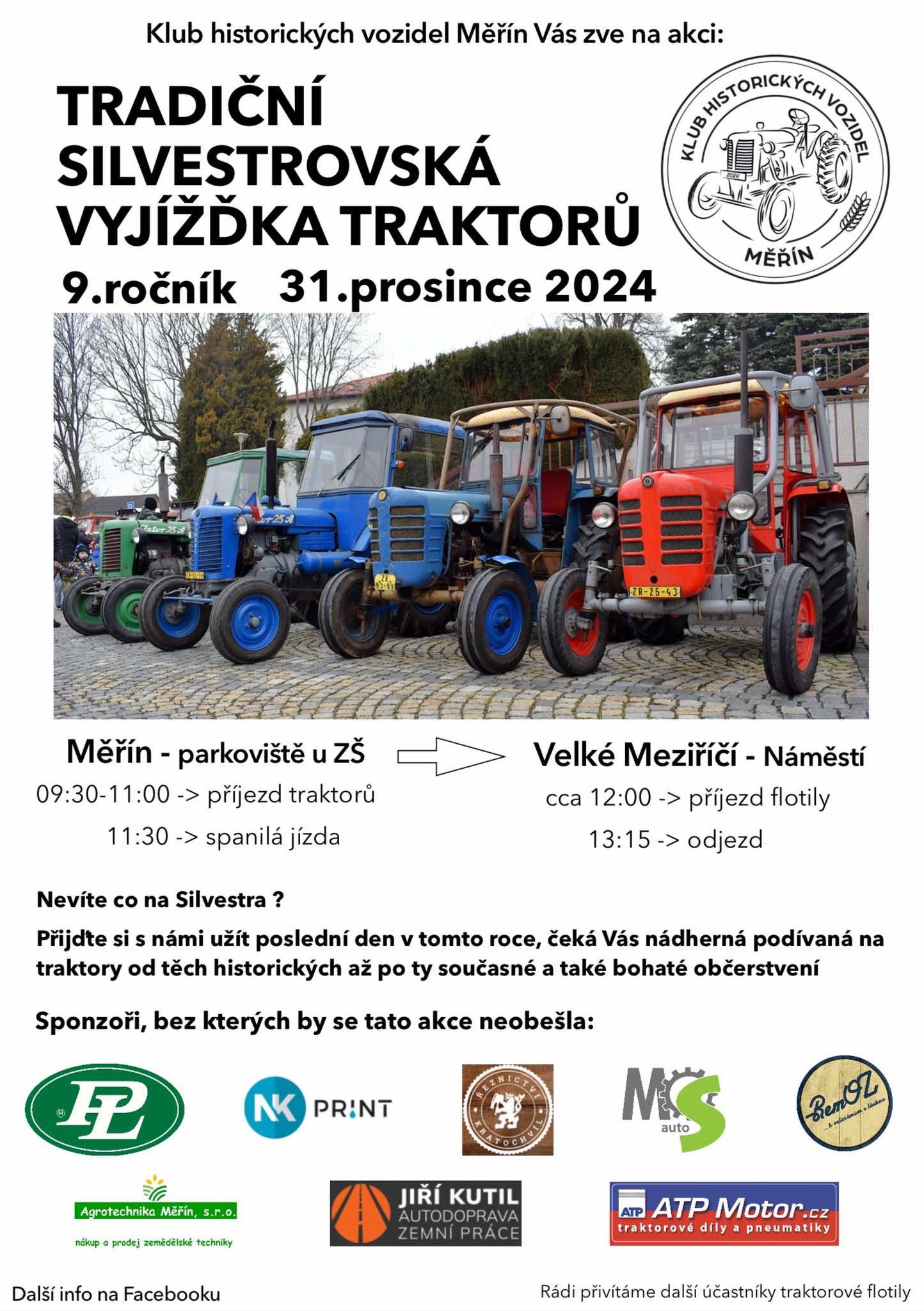 V úterý 31. prosince se uskuteční již 9. ročník silvestrovské vyjížďky traktorů. Kolem půl 10 je připravena moderovaná prohlídka strojů, ta bude v Měříně na parkovišti u školy. Dále v 11:30 všichni zamíří směr náměstí ve Velkém Meziříčí, kam by měli dojet přibližně ve 12:00 hodin. Následovat bude přesun přes Balinské údolí do Šeborova (13:15), kde na farmě rodiny Uchytilových proběhne opékání špekáčků.