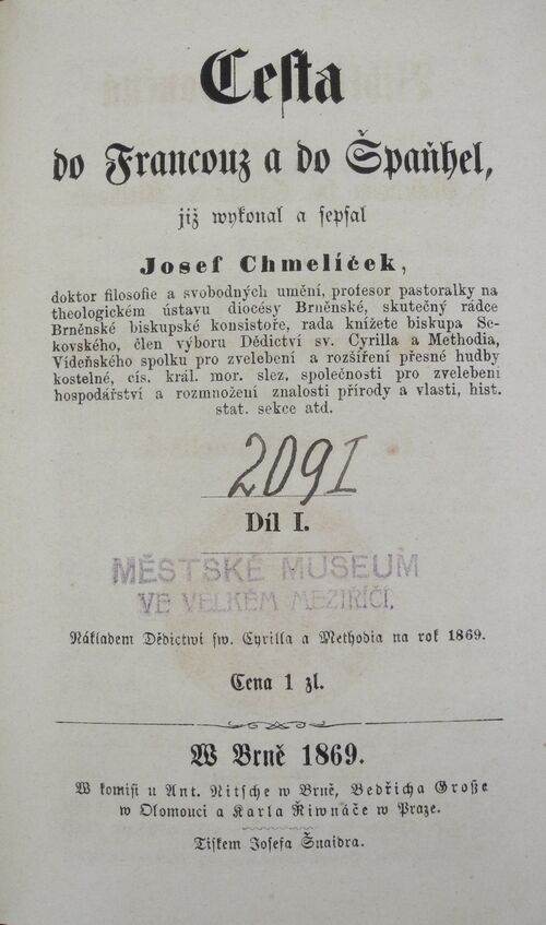 V muzejní knihovně má své místo také řada cestopisů, z nichž můžeme jmenovat třeba Cestu do Francouz a Špaňhel Josefa Chmelíčka z roku 1869 nebo Missie tichomořské z roku 1854. Druhá jmenovaná kniha patřila dle poznámky uvedené na titulní straně Františku Vávrovi z Velkého Meziříčí.