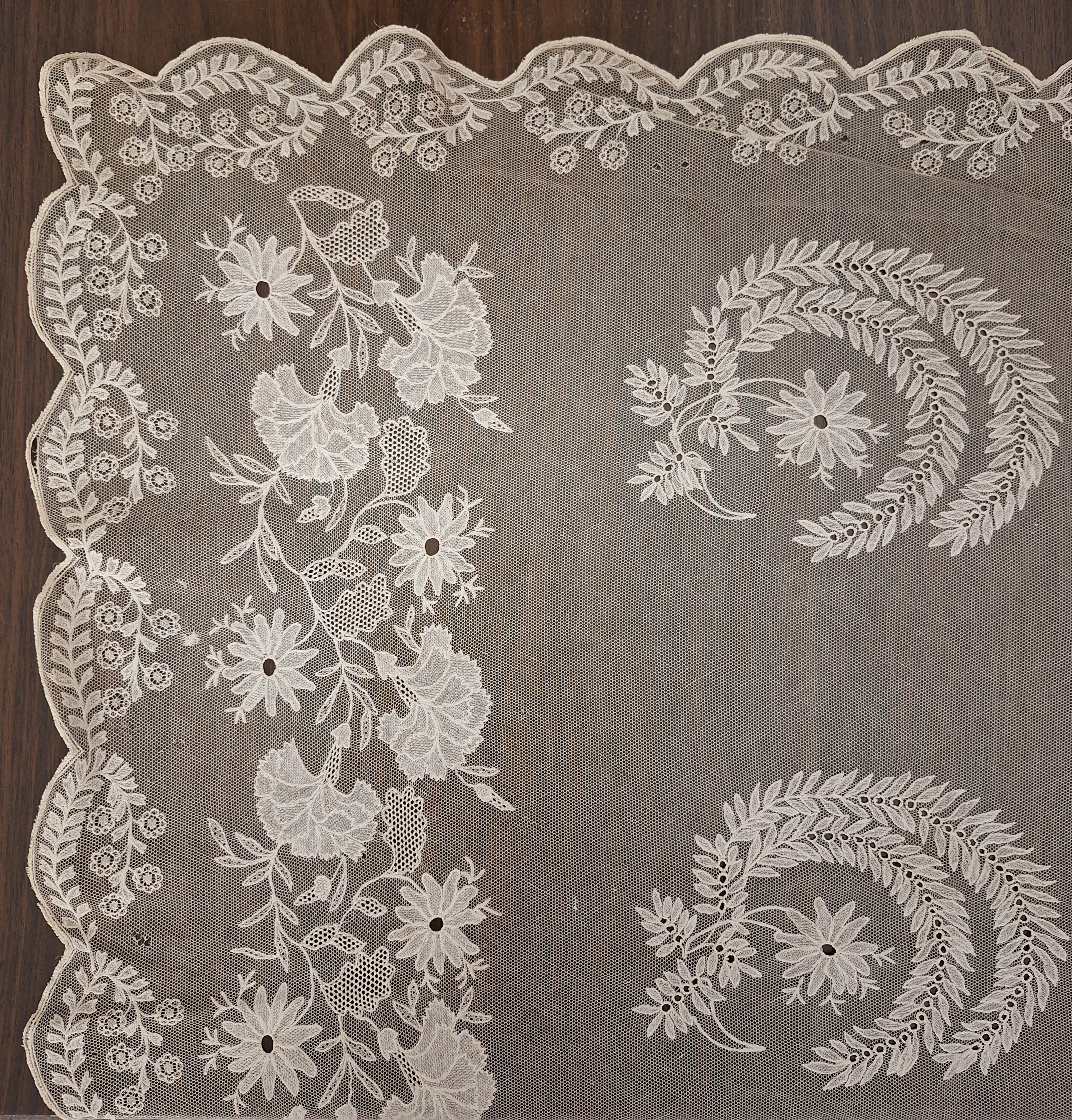 Svatební oděv 19. století nám dokreslí také dva a půl metru dlouhý bílý tylový vyšívaný závoj, který byl nepostradatelnou ozdobou křesťanské nevěsty. Jeho okraje jsou lemovány ozdobnými zoubky, kdy v každém je vyšita stočená větvička rozmarýnky zakončená kytičkou. Oba konce jsou pak zdobeny vyšitými květy karafiátů a kopretin.