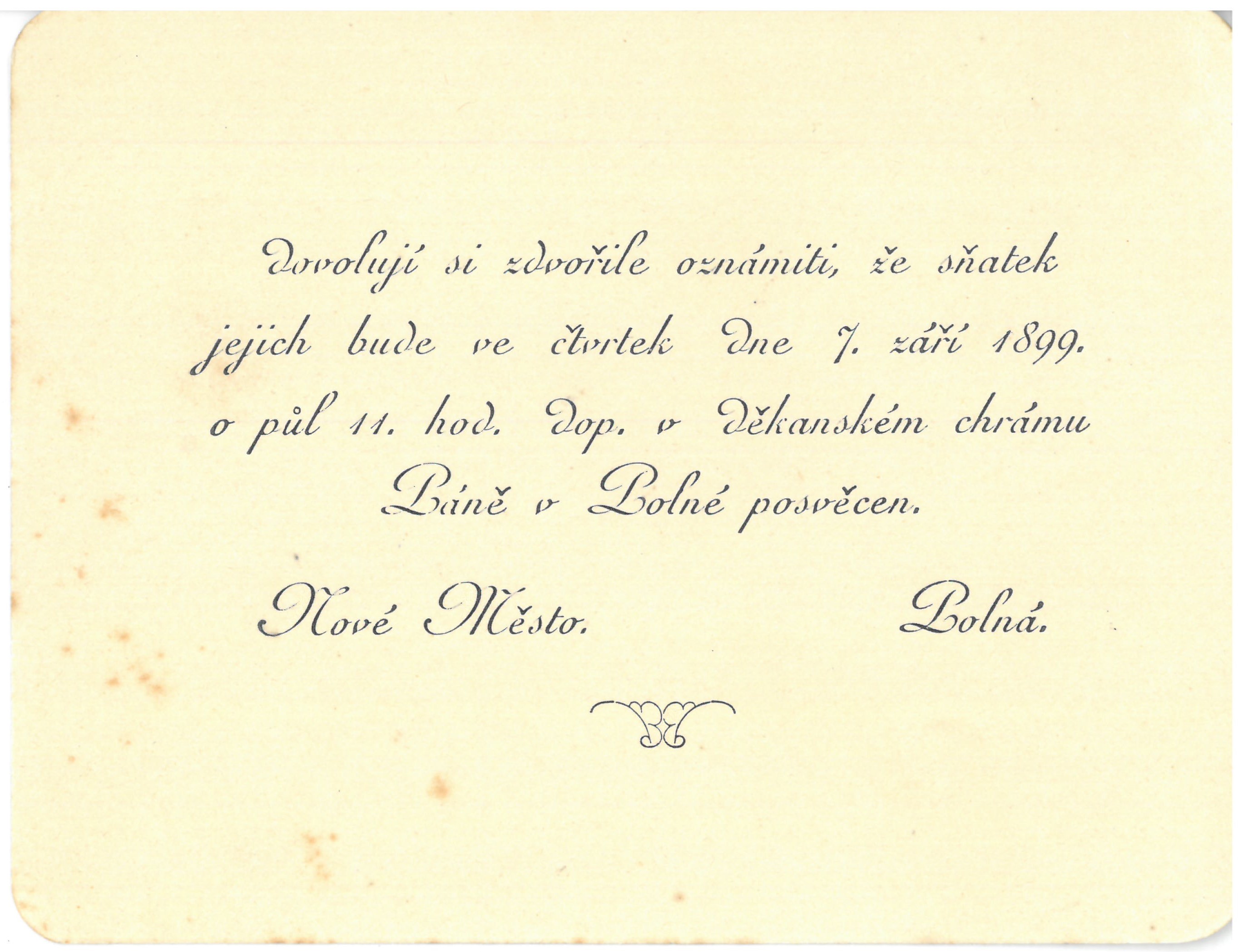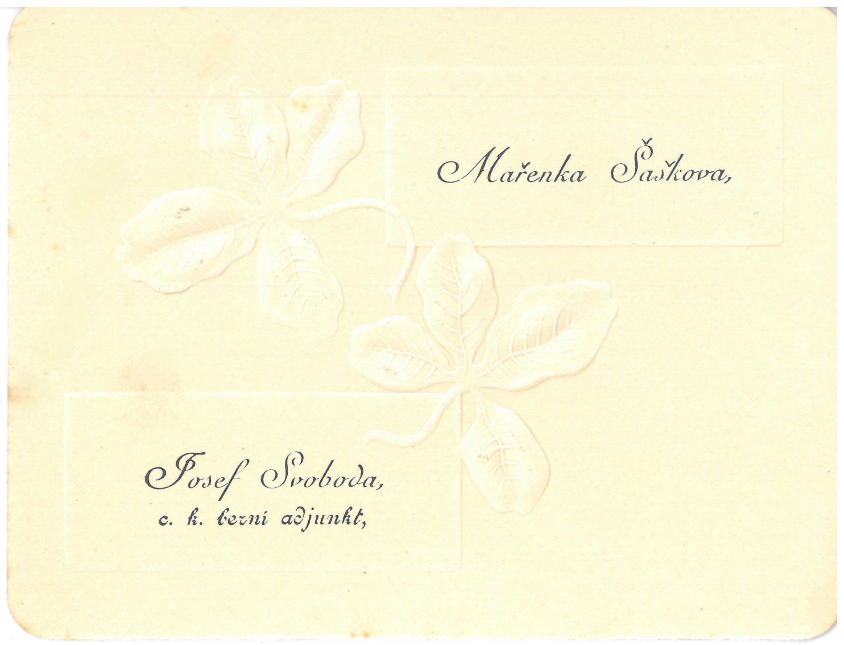 Svatební oznámení s plastickou květinou nám zase sděluje, že Marie Šašková se ve čtvrtek 7. září 1899 v kostele v Polné provdala za berního adjunkta Josefa Svobodu.