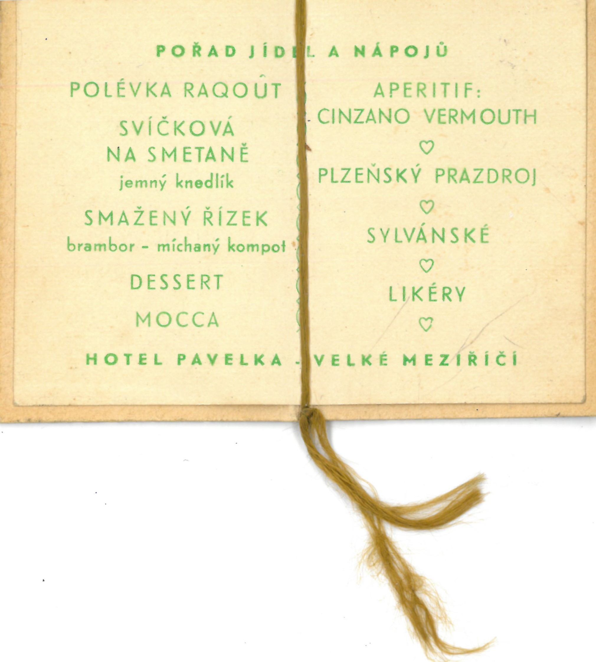 Zajímavostí v muzejním archivu je drobná kartička, díky níž můžeme pomyslně ochutnat menu jedné svatební hostiny. Ta se konala 2. února 1947 v Hotelu Pavelka na náměstí a novomanželé a svatební hosté si mohli pochutnat například na tradiční svíčkové omáčce s knedlíkem a řízku s bramborami, nechyběla ani káva s nezbytným dezertem.