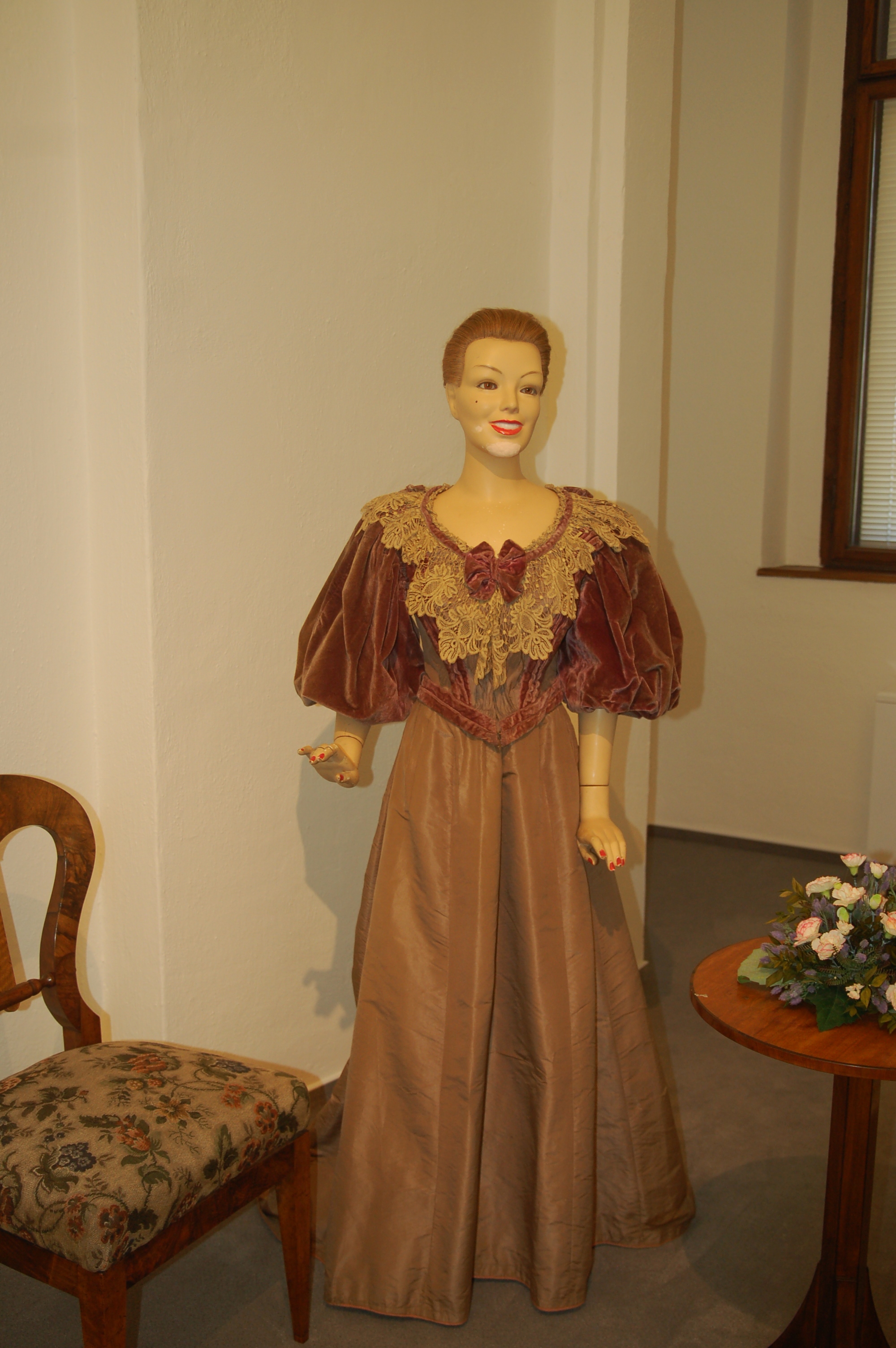 Jedny z dochovaných svatebních šatů darovala do muzea 28. srpna 1963 Ladislava Němečková. Šaty mají svůj původ v nedalekém Budišově, protože, jak je uvedeno v přírůstkové knize, patřily matce řídícího učitele tamní školy paní Tvarůžkové. Jedná se o dvoudílné šaty z těžkého hedvábného taftu skořicové barvy, jejichž historie se začala psát již někdy okolo roku 1850. Sukně je vepředu hladká, vzadu naopak bohatě nabraná a prodloužená ve vlečku. Horní díl má hluboký kulatý výstřih, který je lemován zlatožlutou krajkou se zoubky, zapínání je tvořeno řadou háčků a oček. Celkový dojem pak umocňují krátké a bohatě nabírané rukávy.