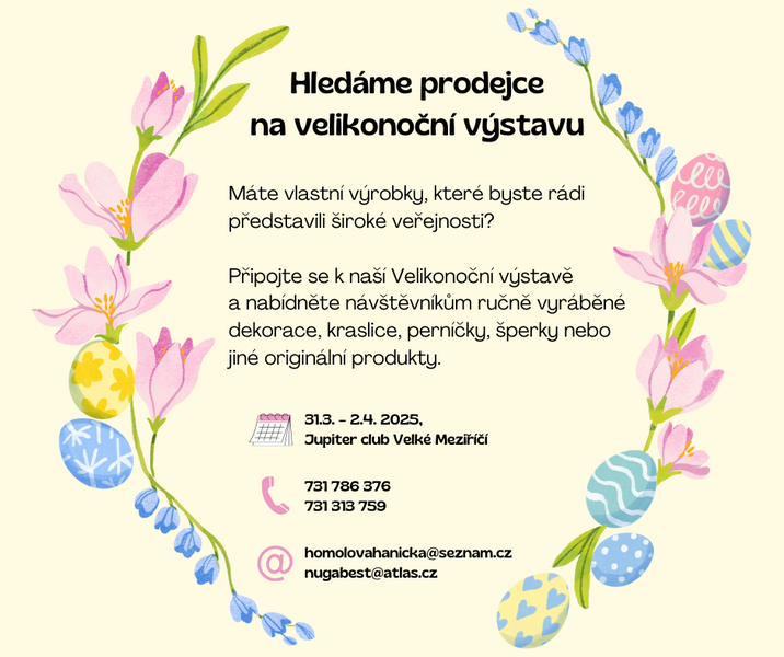Máte vlastní výrobky, které byste rádi představili veřejnosti? Připojte se k velikonoční výstavě a nabídněte návštěvníkům ručně vyráběné dekorace, kraslice, perníčky, šperky nebo jiné originální produkty.