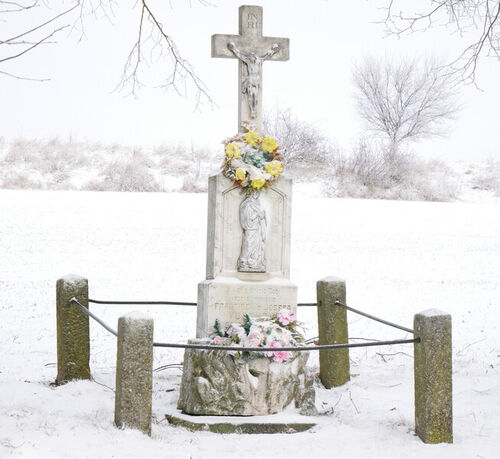 Západně od Svařenova, u silnice, která směřuje do Frankova Zhořce, stojí pěkný bílý zdobený kamenný kříž s postříbřenými figurami Ježíše Krista a Panny Marie. Kříž je postaven na soklu z hrubého kamene, u kterého jsou vždy květiny. Kolem kříže je ohrádka z kamenných sloupků a kovových tyčí. V dolní části kříže je nápis: Ku cti a chvále Boží / věnovali manželé / FRANTIŠEK a JOSEFA / VLACHOVI / ZE SVAŘENOVA.
