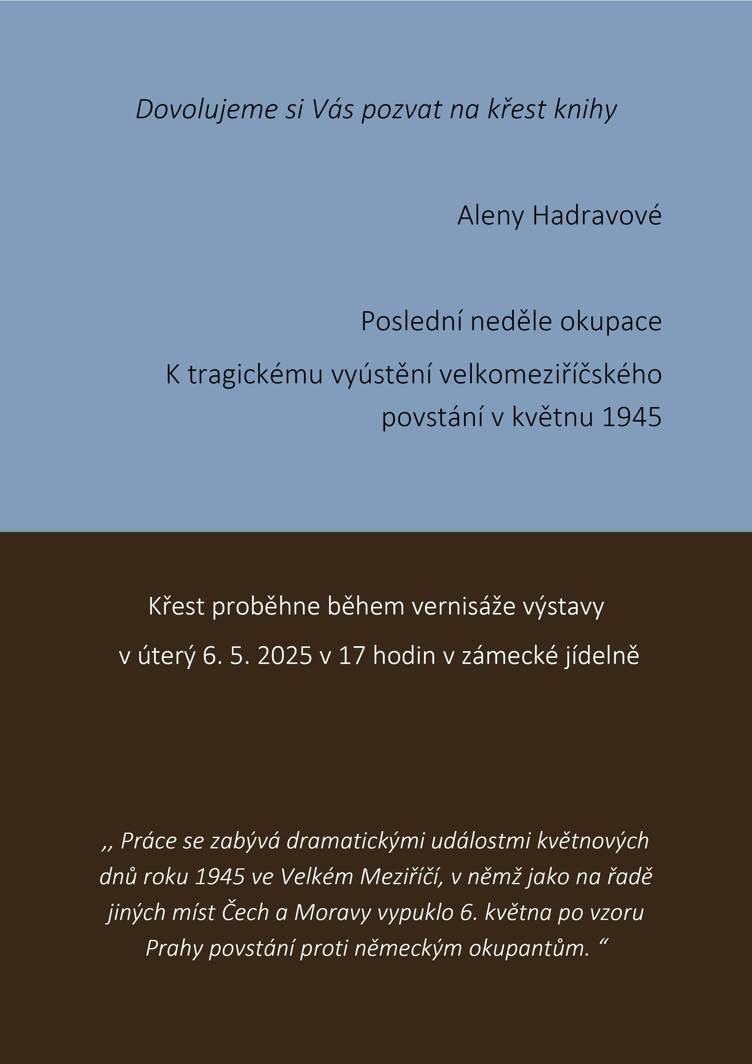 Součástí vernisáže bude také křest knihy Poslední neděle okupace, která se zabývá dramatickými událostmi květnových dnů roku 1945 ve Velkém Meziříčí. Autorkou knihy je velkomeziříčská rodačka Alena Hadravová, jejíž profesní dráha je spjata především s Akademií věd České republiky.