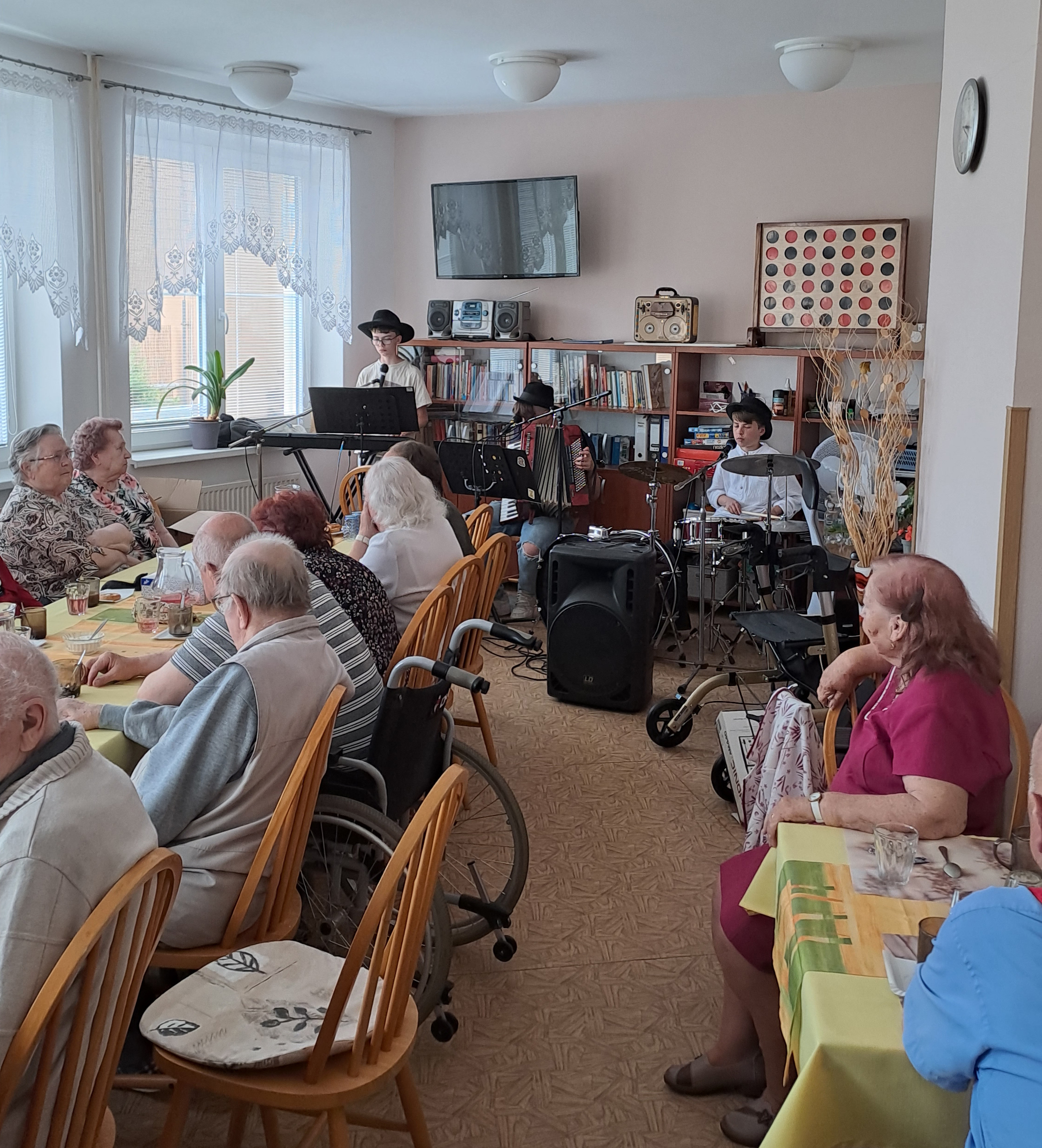 Muzikanti vypadali velmi mladě a také hodně mladí byli. Šlo o dva žáky 7. a 8. třídy základní školy a jednoho terciána z Gymnázia Velké Meziříčí. Harmonika, klávesy a buben, to vypadalo slibně. Ale to hlavní teprve přišlo. Paní ředitelka je představila a muzikanti spustili. Hráli a zpívali na lidovou notu písničky, které jsme všichni znali, a s chutí jsme zpívali s nimi. Už během jejich vystoupení se mezi námi ozývaly hlasy, že jsou lepší než někteří dospělí muzikanti. Jaromír Sedlák (harmonika), František Kaman (klávesy) a Jakub Podsedek (buben) jsou všichni ze Lhotek a jejich rodiče i obec na ně mohou být pyšní. Jsou to prostě pašáci, kteří mají rádi muziku a ta z nich udělala dobré kamarády. Přivezl je k nám otec jednoho z nich a bylo vidět, jakou radost má ze syna i celé kapely. Kapela vydržela hrát 2 hodiny a my jsme se s ní loučili s přáním, aby k nám zase někdy přišli. Tak ještě jednou: Bravo, chlapci!