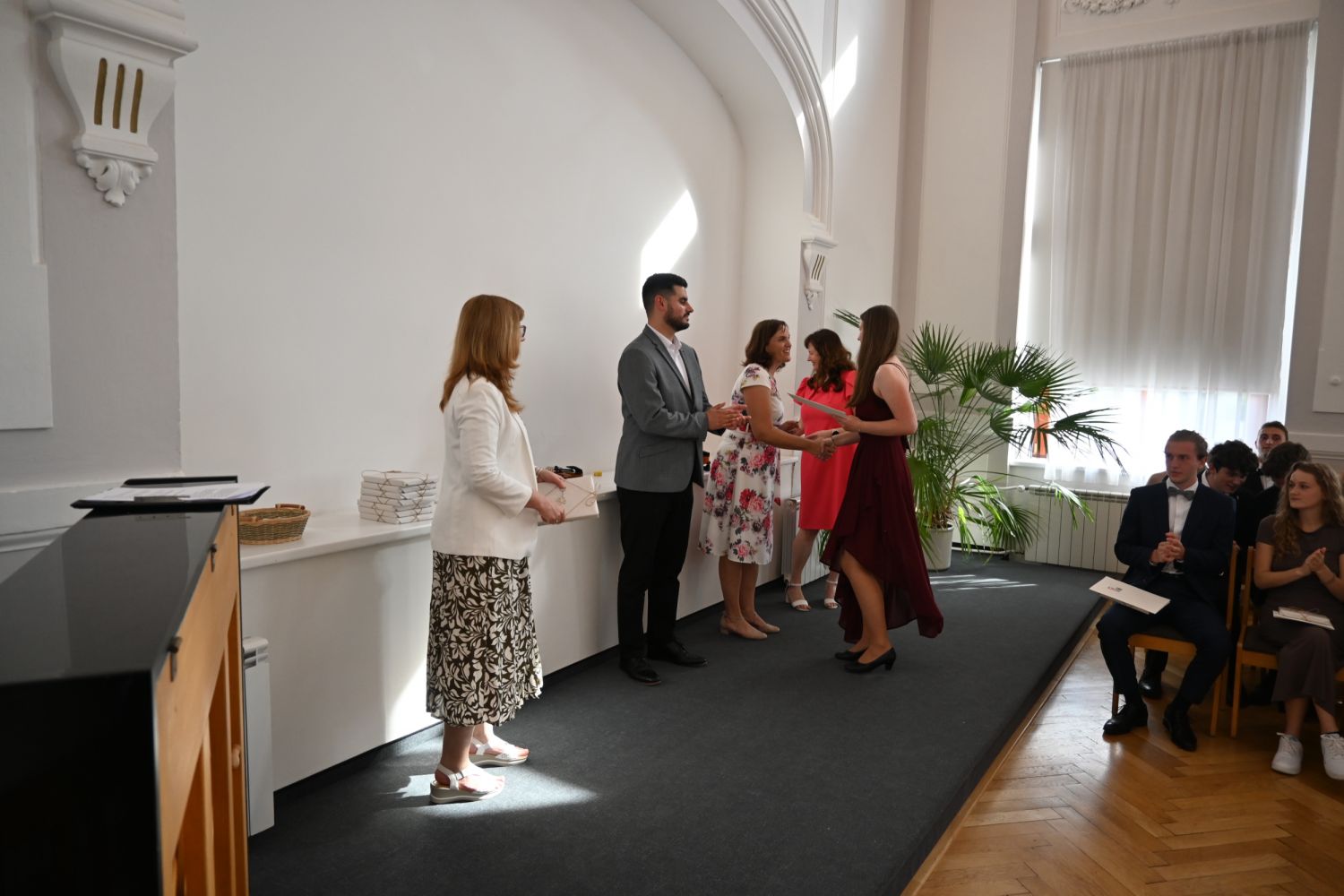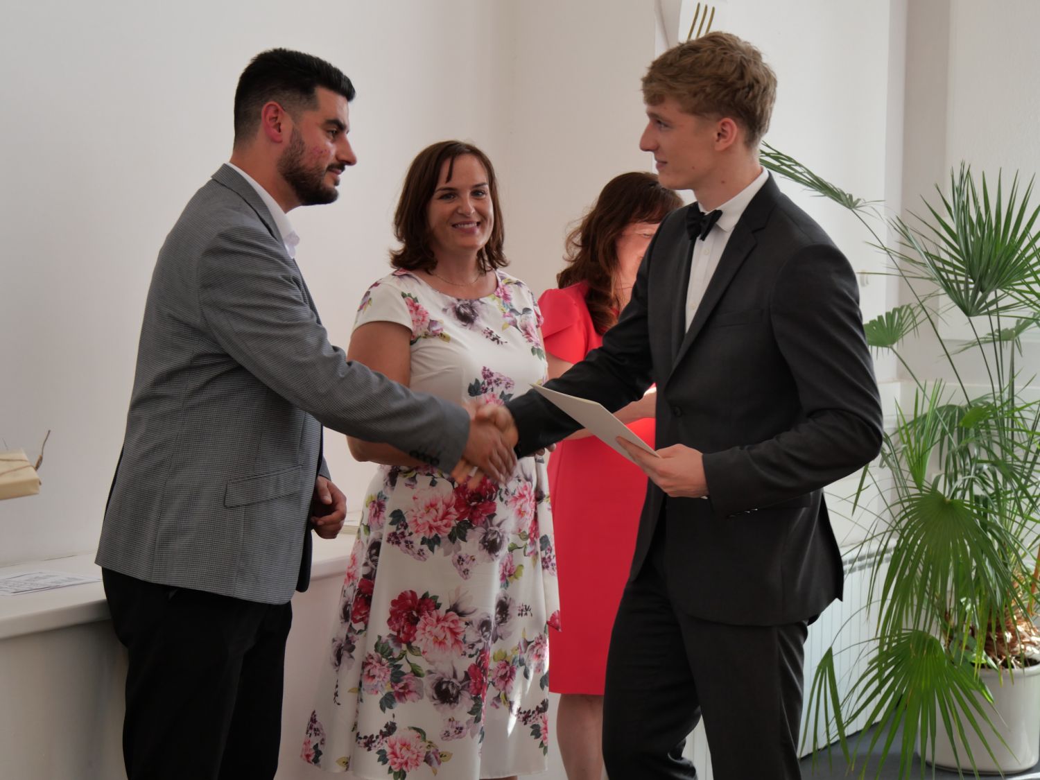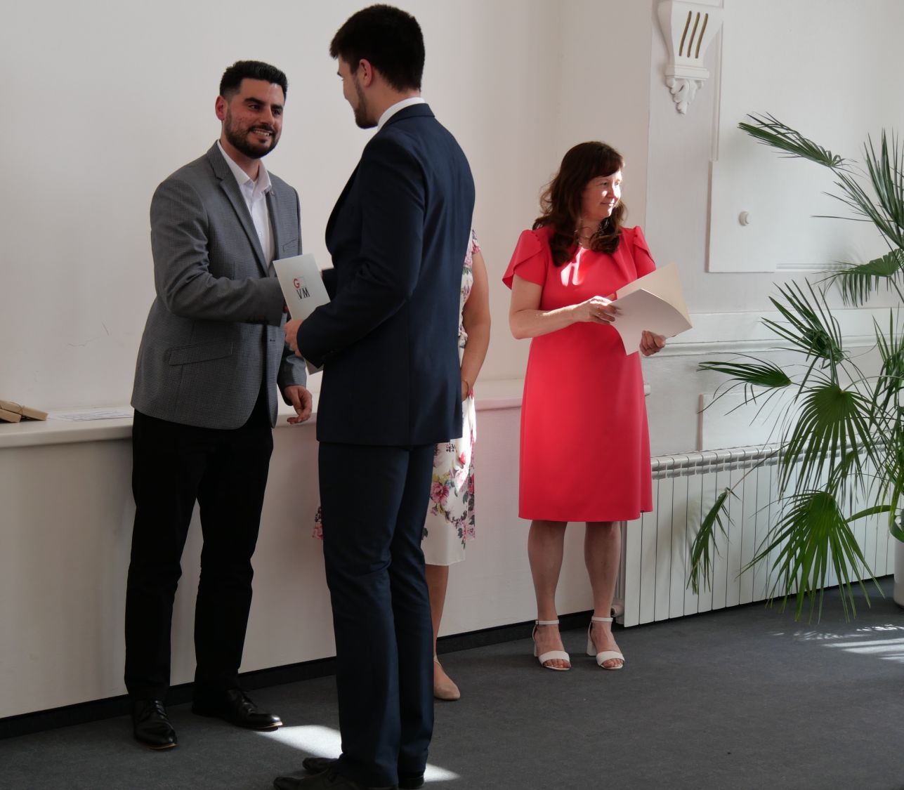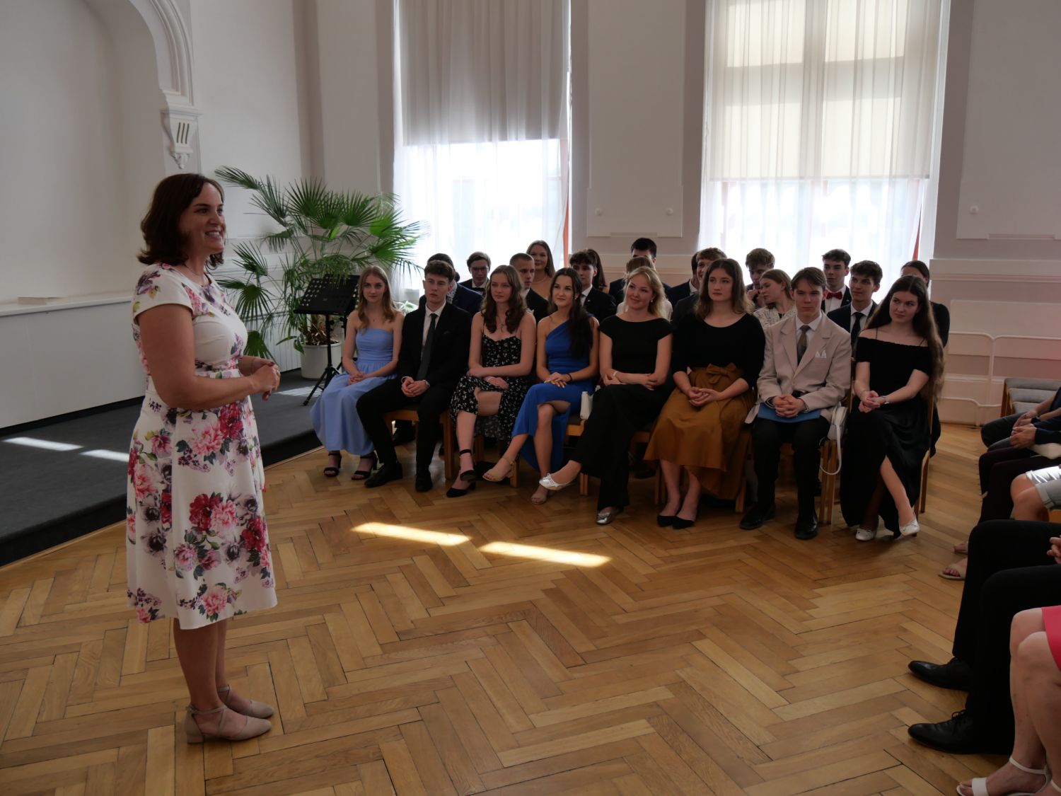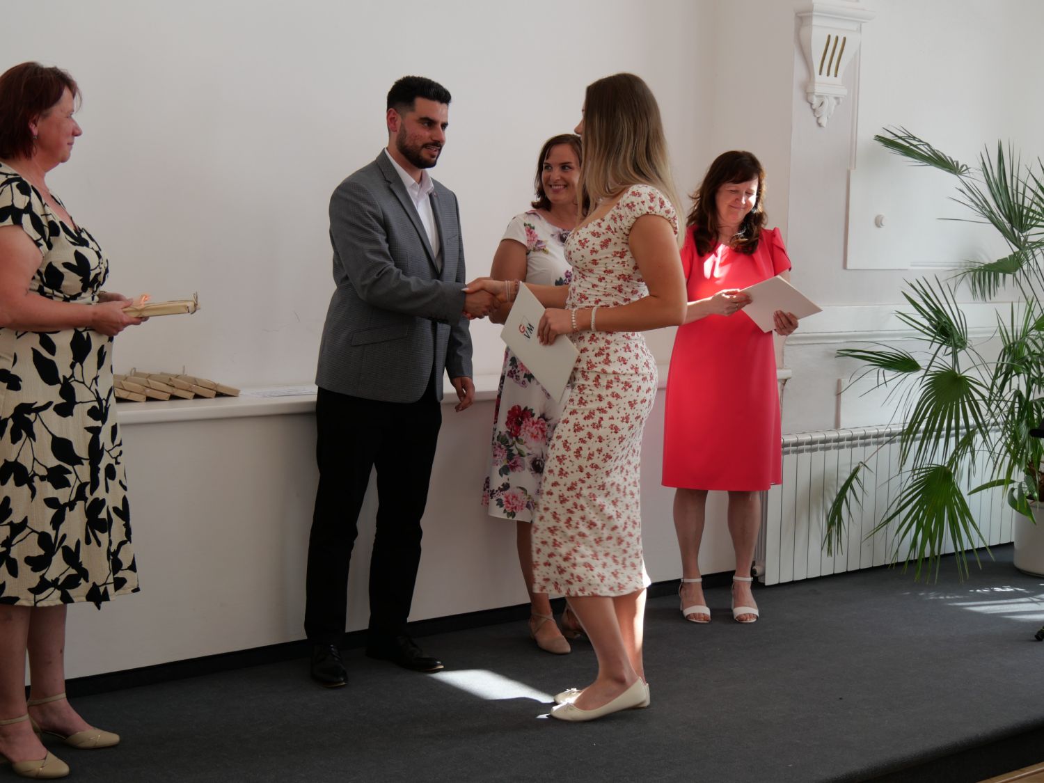 V aule školy absolventi převzali z rukou ředitelky Ilony Pokorné a starosty města Alexandrose Kaminarase ještě čerstvá maturitní vysvědčení. Šlo o 49 maturantů ze tříd 8. A a 4. C. Mimo maturitních vysvědčení dostali absolventi i vysvědčení za poslední ročník, dále pak drobný dárek a čtyři z nich stipendium za to, že po celou dobu studia prošli s vyznamenáním.