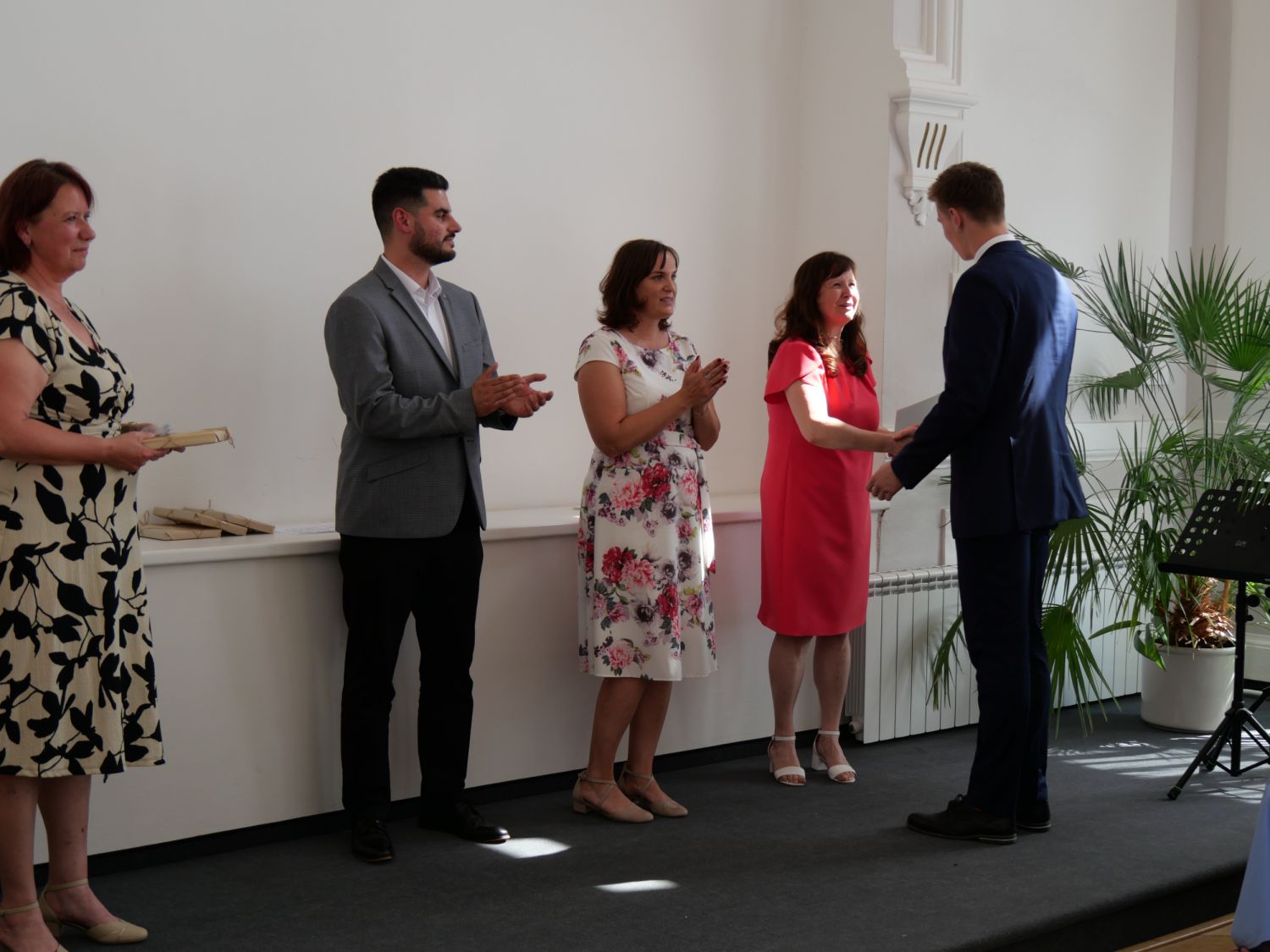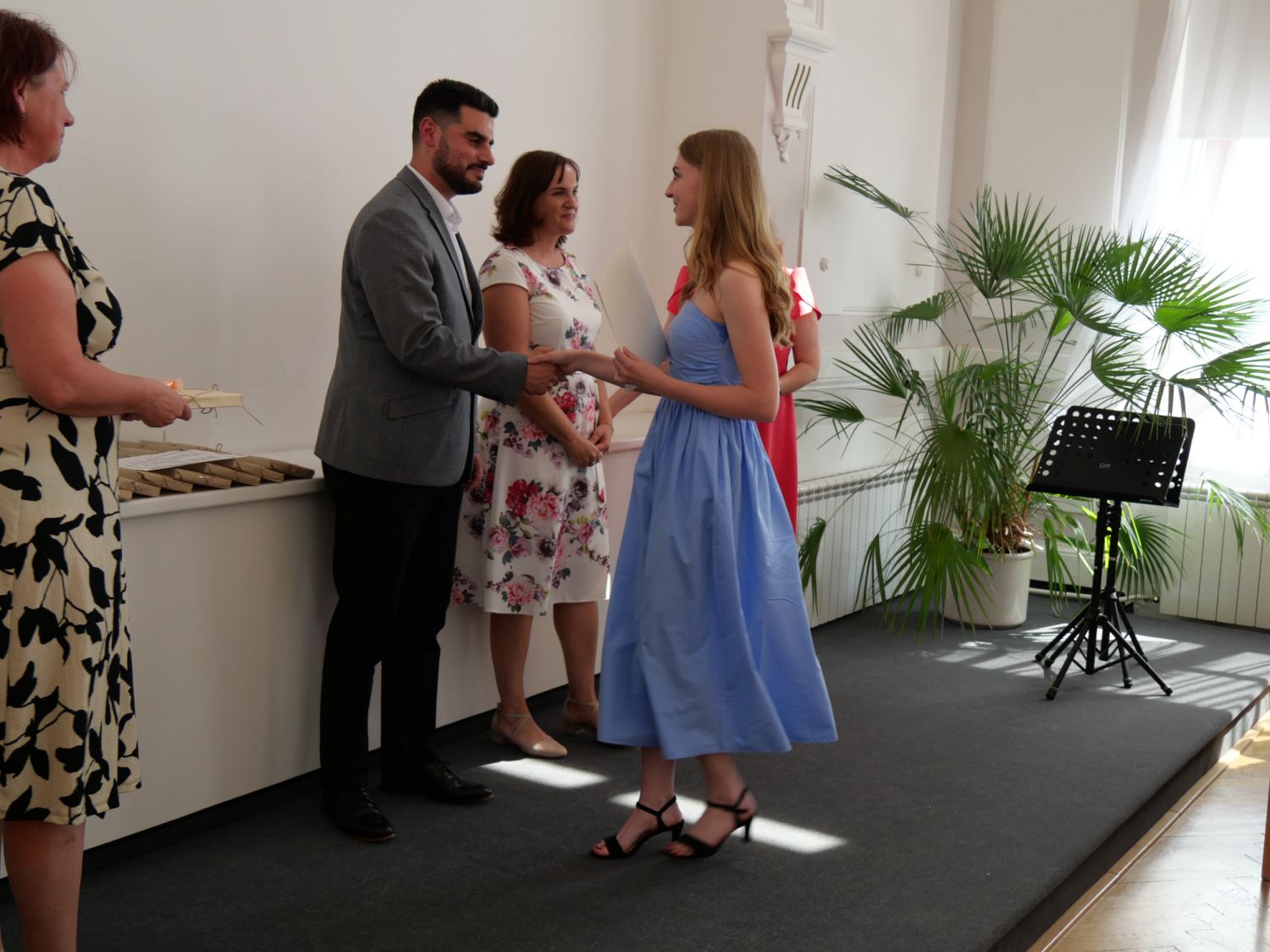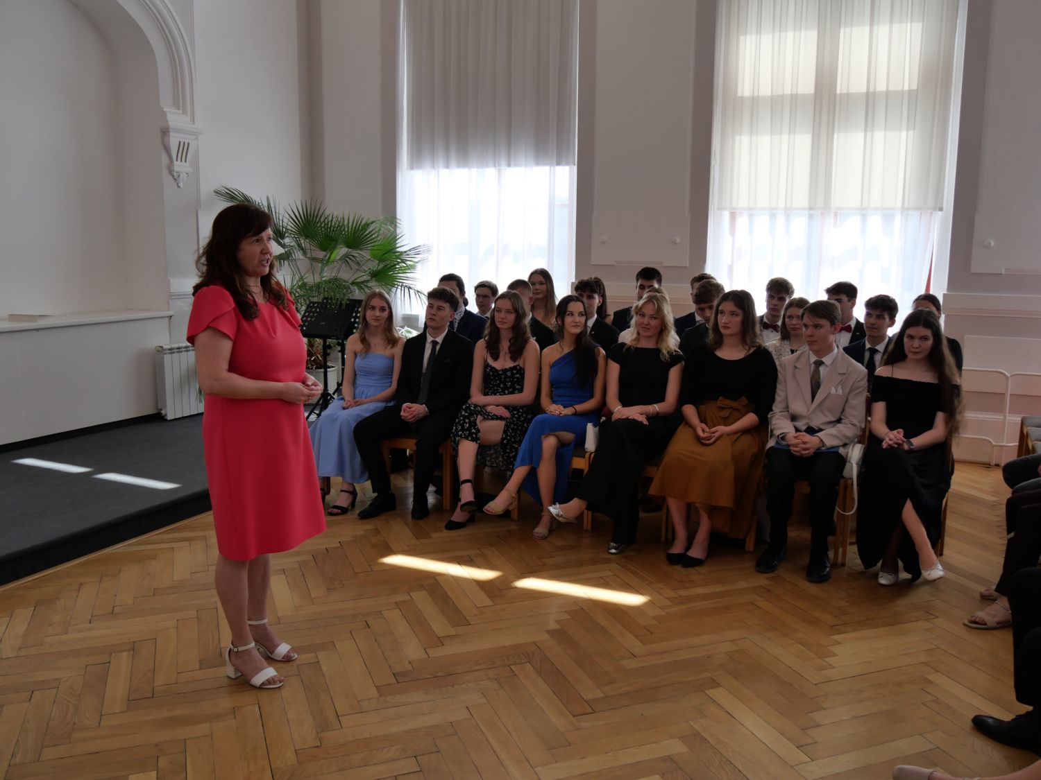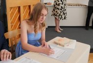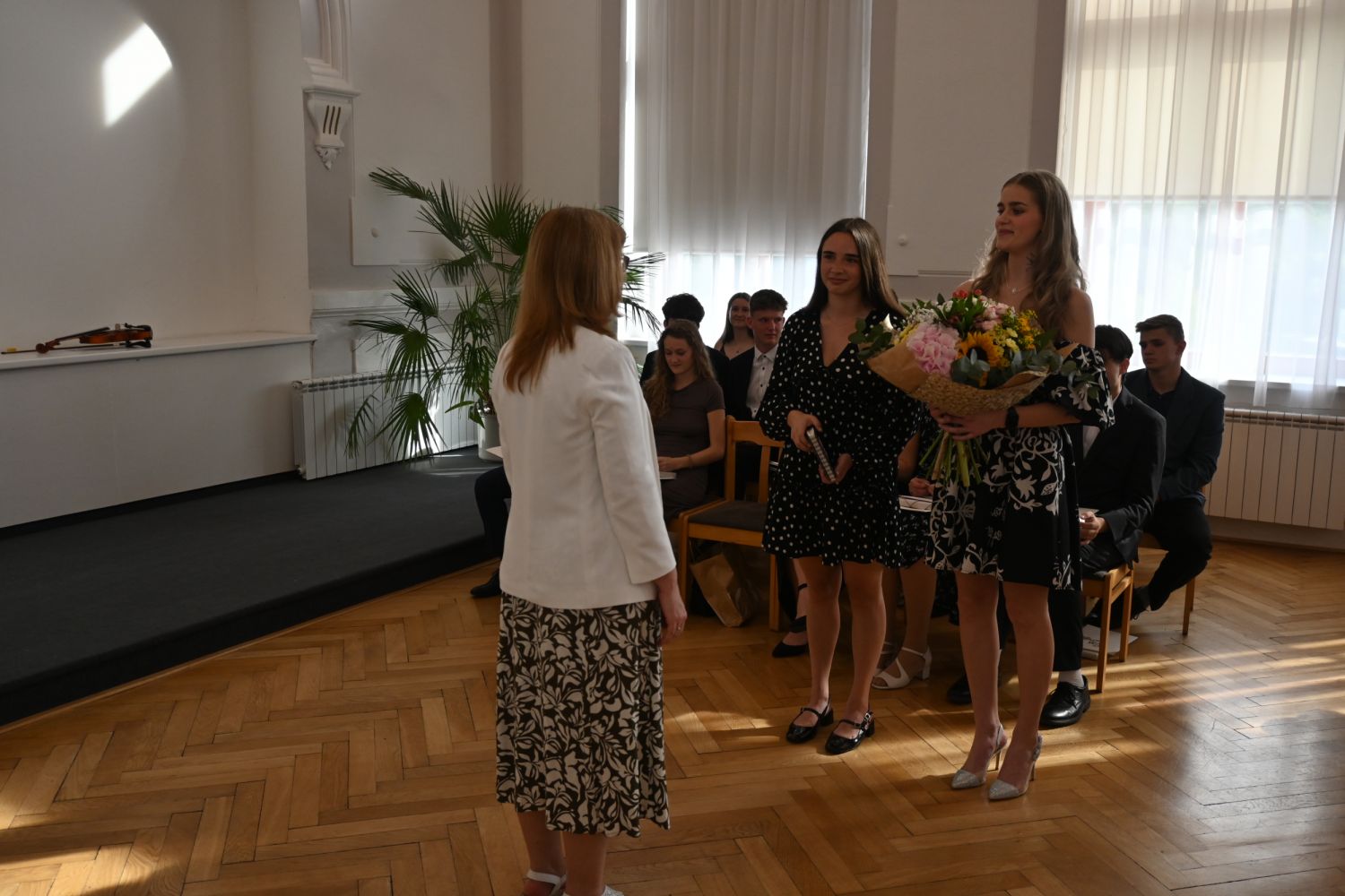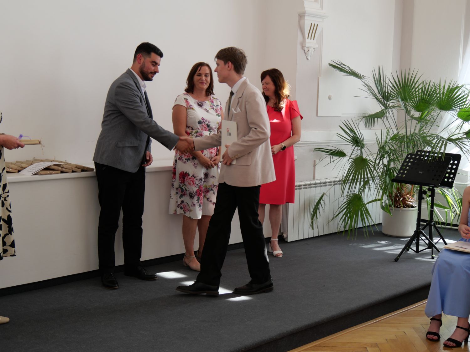 V aule školy absolventi převzali z rukou ředitelky Ilony Pokorné a starosty města Alexandrose Kaminarase ještě čerstvá maturitní vysvědčení. Šlo o 49 maturantů ze tříd 8. A a 4. C. Mimo maturitních vysvědčení dostali absolventi i vysvědčení za poslední ročník, dále pak drobný dárek a čtyři z nich stipendium za to, že po celou dobu studia prošli s vyznamenáním.