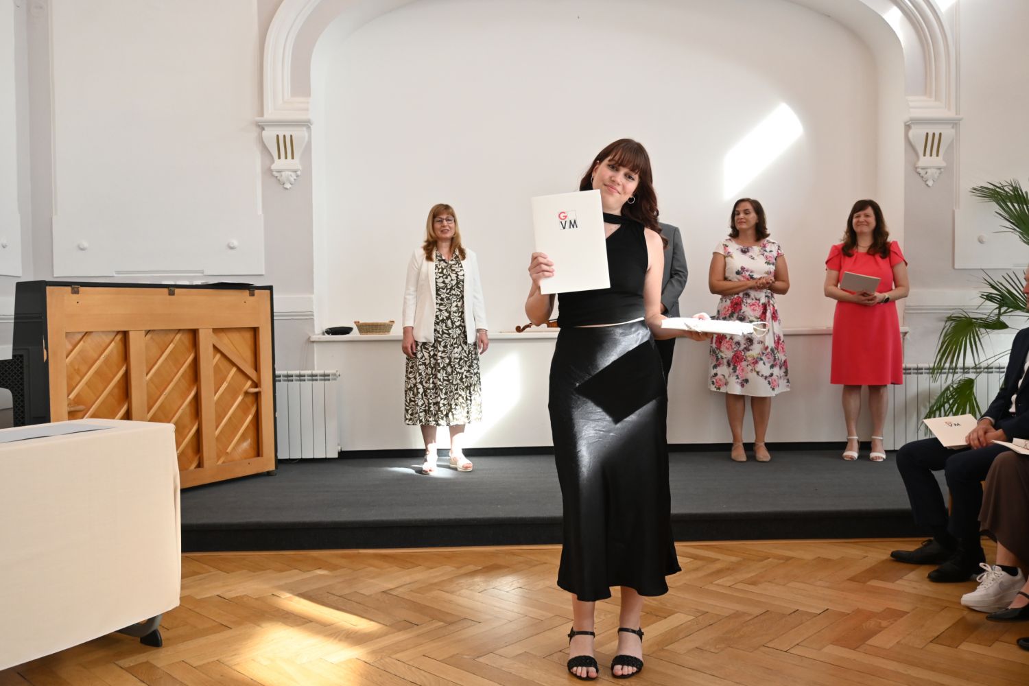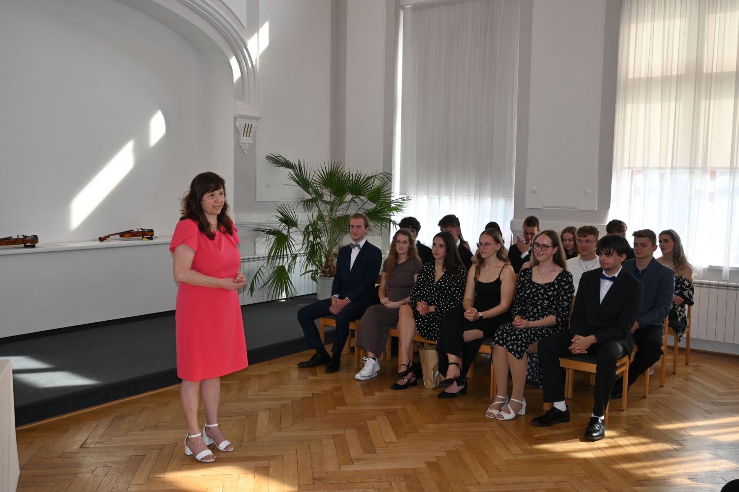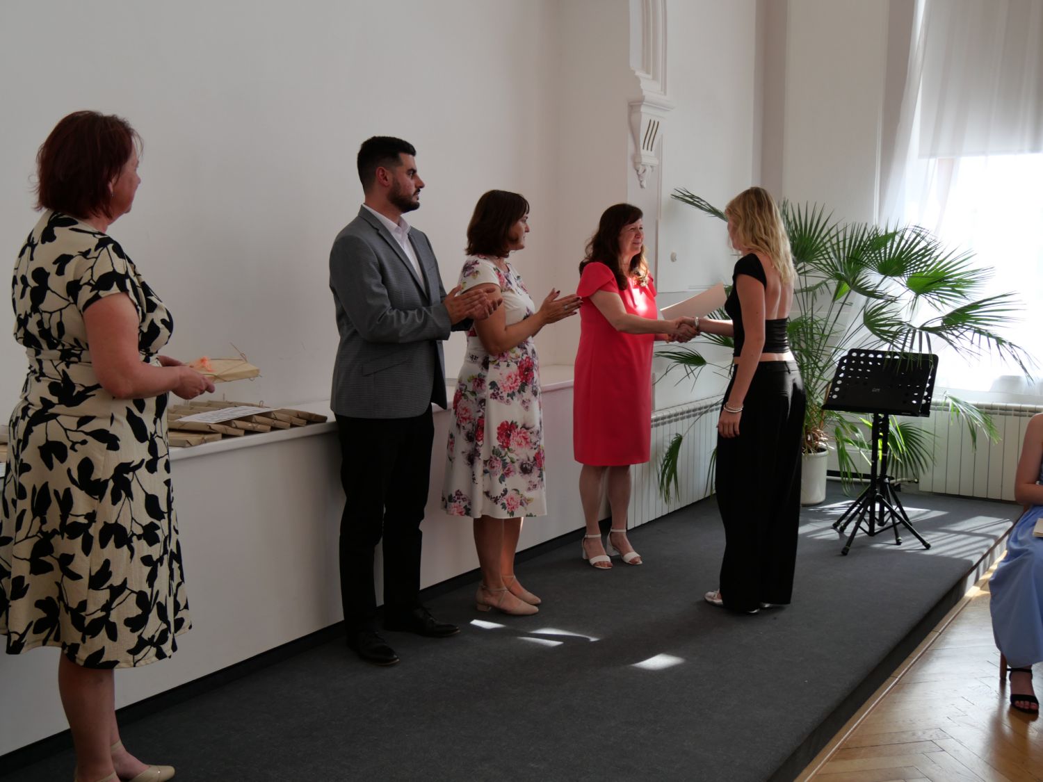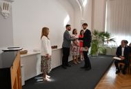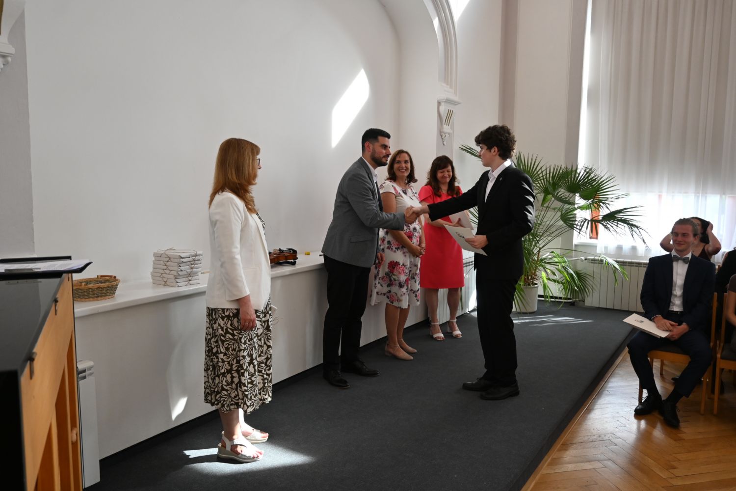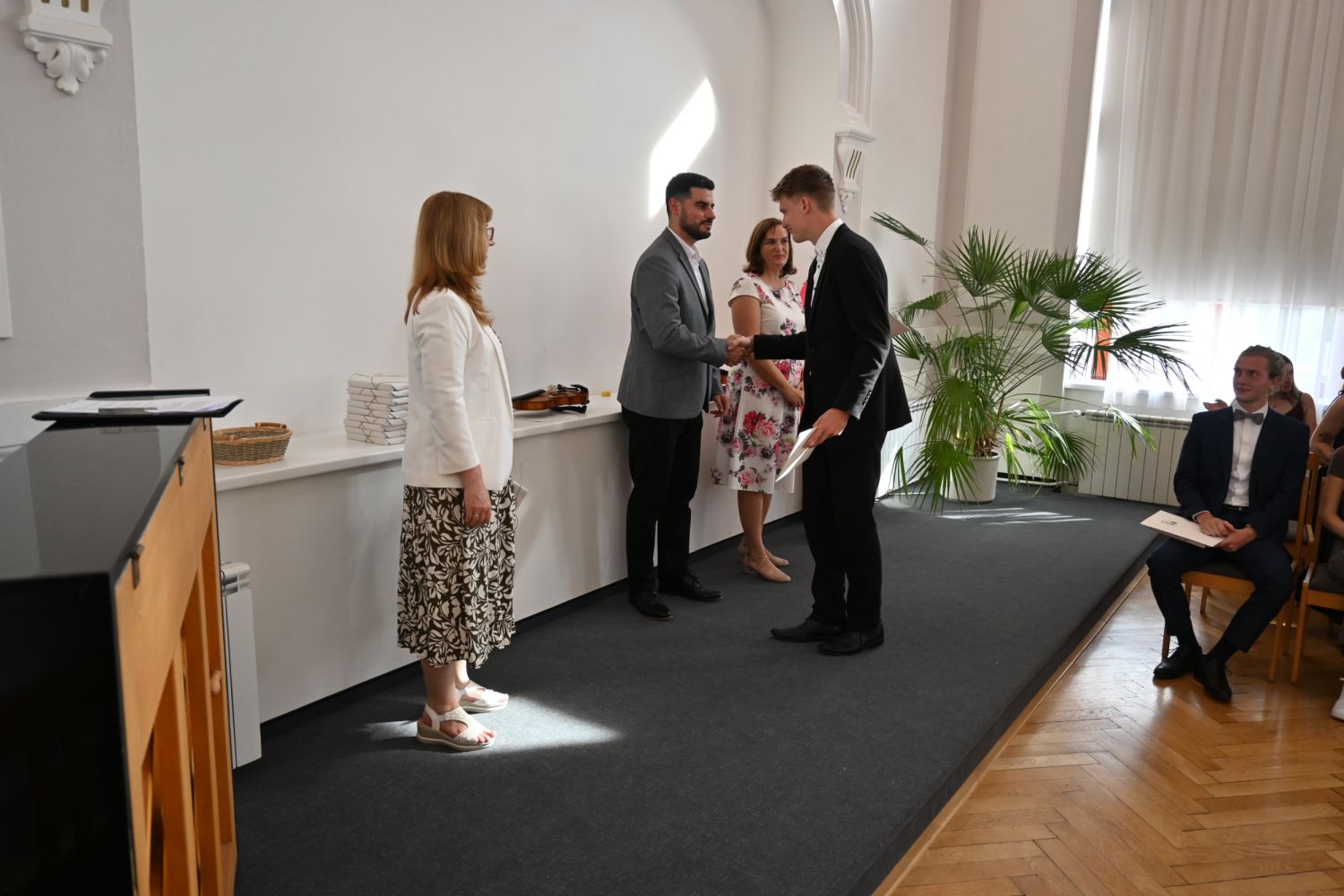 V aule školy absolventi převzali z rukou ředitelky Ilony Pokorné a starosty města Alexandrose Kaminarase ještě čerstvá maturitní vysvědčení. Šlo o 49 maturantů ze tříd 8. A a 4. C. Mimo maturitních vysvědčení dostali absolventi i vysvědčení za poslední ročník, dále pak drobný dárek a čtyři z nich stipendium za to, že po celou dobu studia prošli s vyznamenáním.